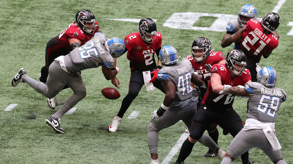 But as they had much of the afternoon, Detroit's defense stepped up, forcing the game's first turnover. Defensive end Romeo Okwara was able to chop the ball free from the grasp of quarterback Matt Ryan and Flowers jumped on the loose ball, giving the ball back to the Lions offense inside Falcons territory.
