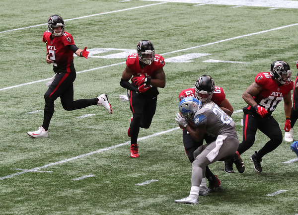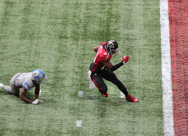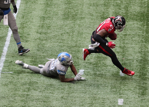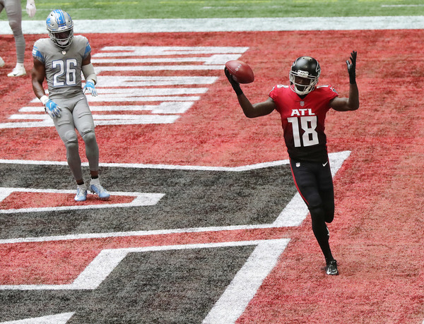 Converting a fourth down near midfield early in the second quarter to keep the series alive, Falcons receiver Calvin Ridley made a difficult catch along the sideline for 19 yards before drawing a defensive pass interference call in the end zone working against rookie cornerback Jeff Okudah. That set up Gurley to power it across the goal line to tie the game, 7-7.