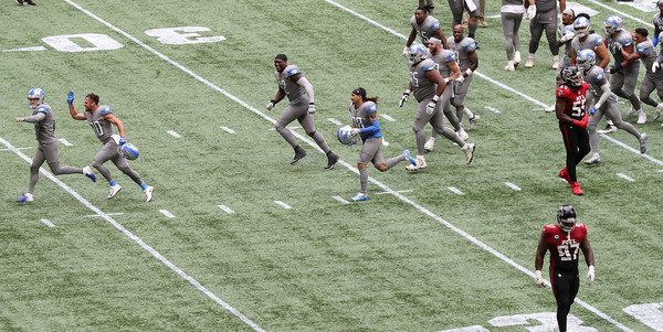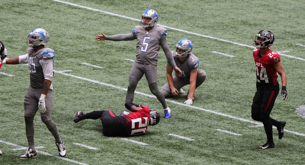 Detroit Lions kicker Matt Prater, far left, is chased off the field by celebrating teammates after making the extra point attempt to beat the Atlanta Falcons, 23-22, as time expires on Sunday, Oct. 25, 2020, at Mercedes-Benz Stadium in Atlanta. (Curtis Compton/Atlanta Journal-Constitution/TNS)
