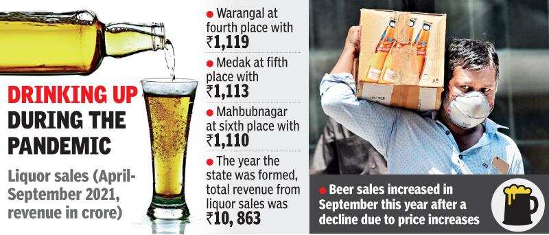 HYDERABAD: Telangana’s liquor sales have shown significant growth with the excise department generating Rs 14,230 crore (combined beer and IMFL) in the first six months of this fiscal year. Most of it, however, largely rides on sales in districts. Hyderabad ranks third among the state’s districts with most sales. Beer sales increased in September this year after a decline due to price increases.