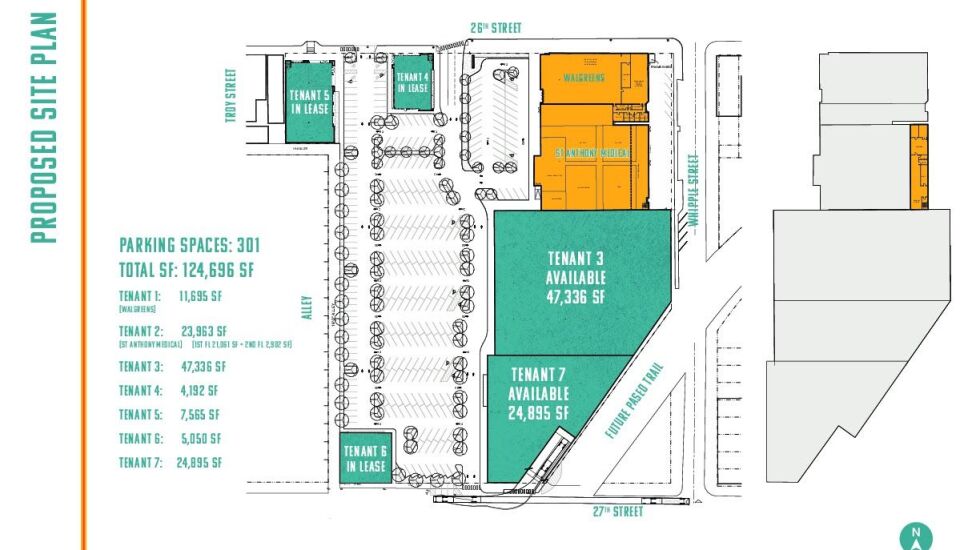 The only tenants named in a listing brochure include Walgreens — already a tenant — and a tenant associated with a new wellness center coming to Little Village from St. Anthony Hospital at the corner of 31st Street and Kedzie Avenue. The new St. Anthony site would replace the current Esperanza Health Centers location, according to the document.