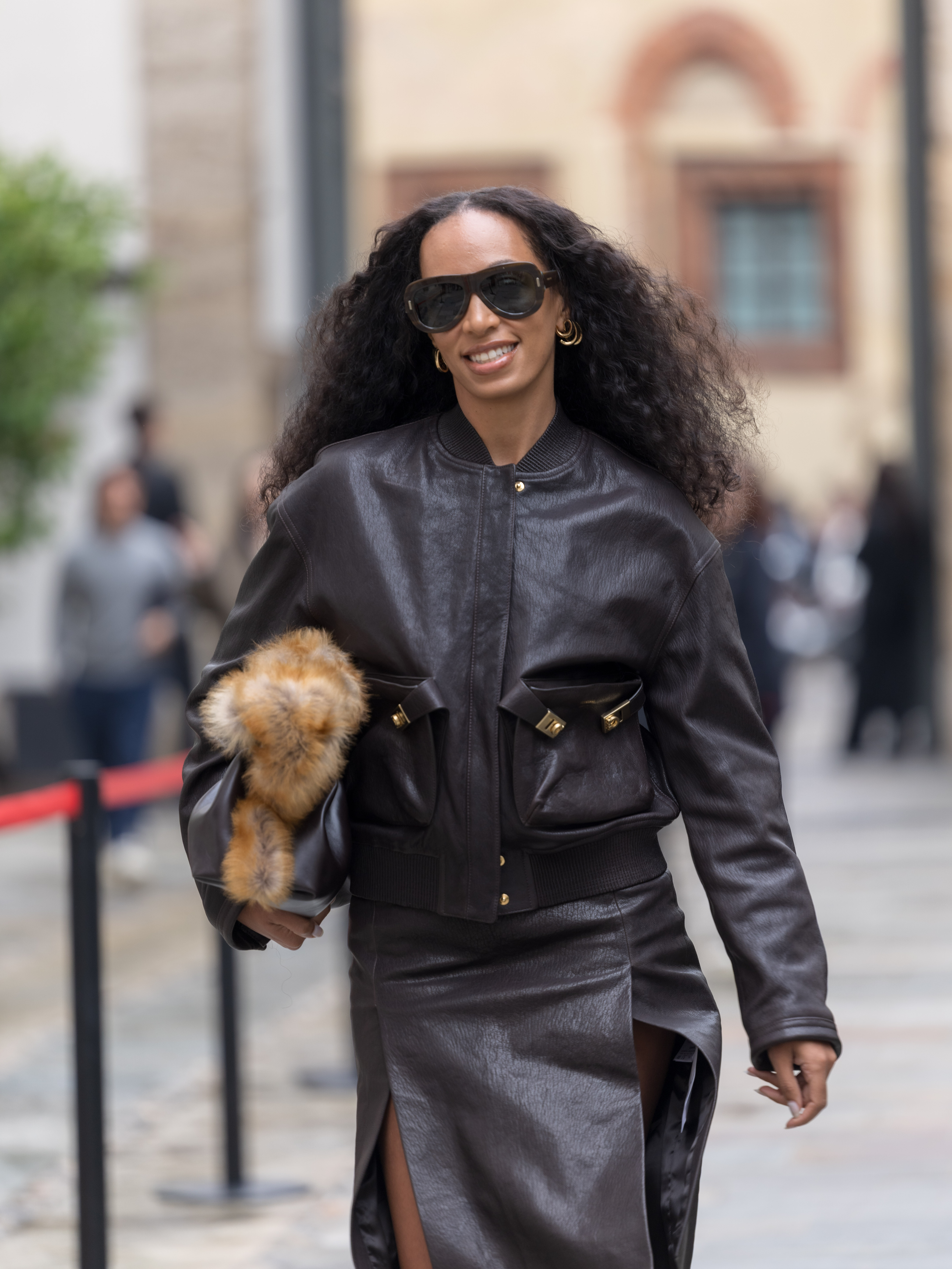 Solange and stylist Danielle Goldberg have long put their powers together to turn out Ferragamo looks. That doesn't at all lessen the thrill of seeing the singer back in the Spring 2026 front row, wearing an enviable leather aviator jacket and side-slit matching skirt.