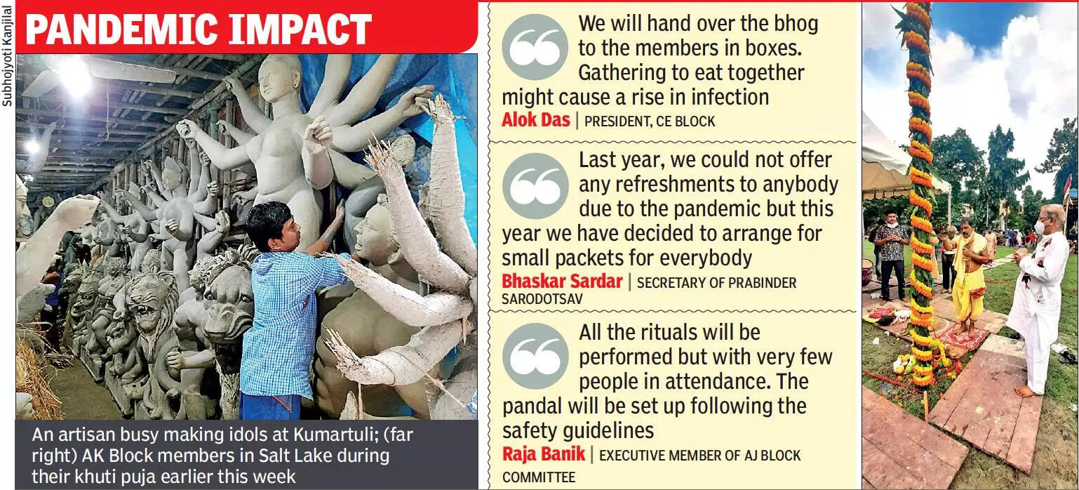 “We have decided to do away with the sit-down arrangement for eating during the festival. We will hand over the bhog to the members in boxes. Gathering to eat together might cause a rise in infection which we do not want at any cost,” said Alok Das president of CE block.