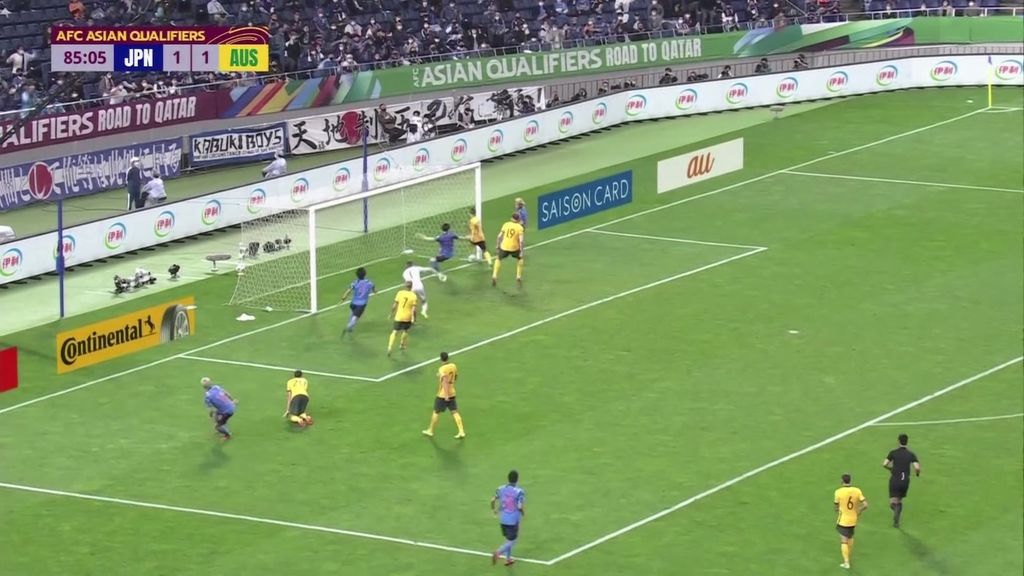 Japan goes straight up the other end and Takuma Asano, on for Takumi Minamino, forces another really good save from Mat Ryan after Kyogo Furuhashi's shot was blocked.
