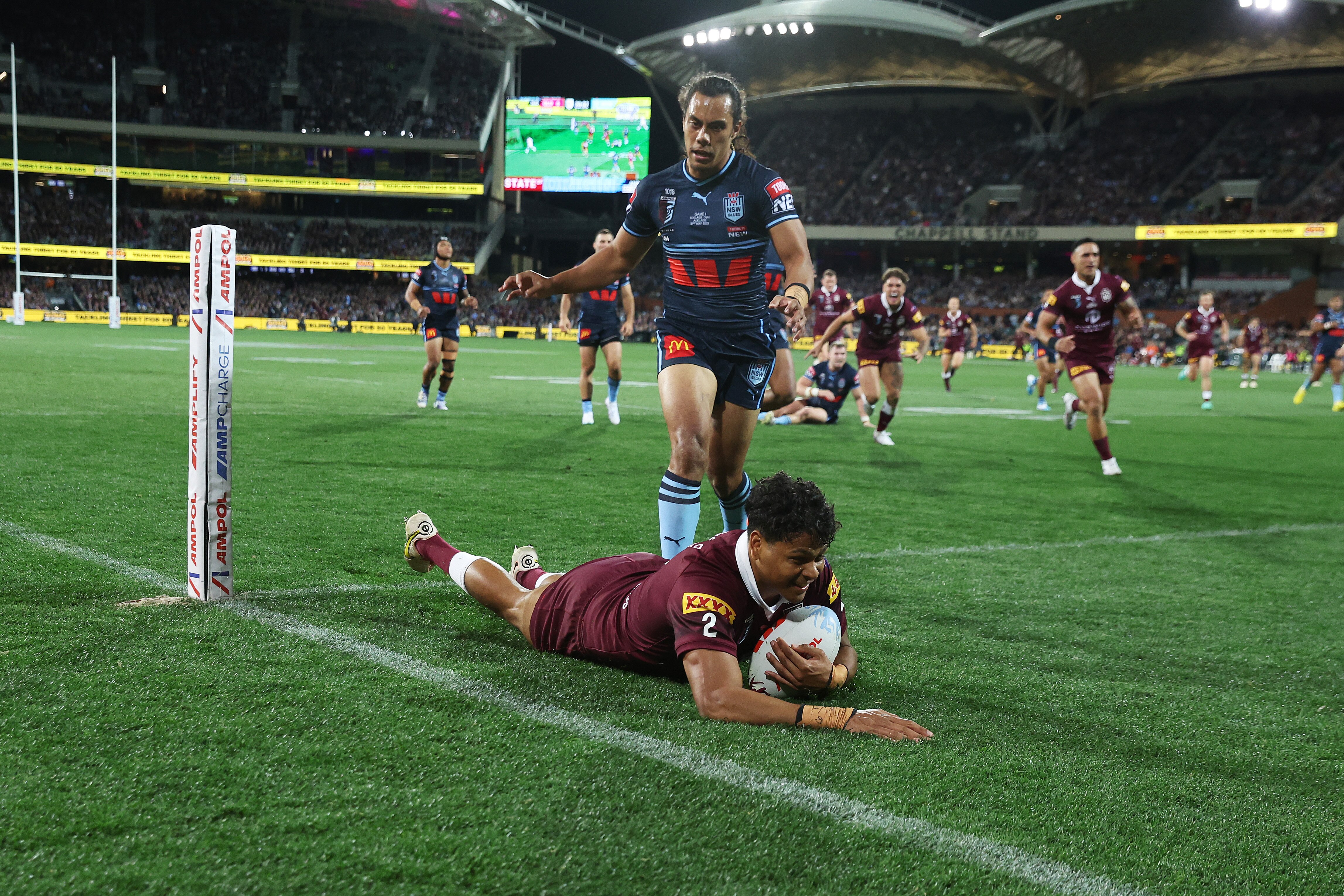 The Maroons shift the ball left through Cameron Munster and then a long ball finds Hamiso Tabuai-Fidow on the right, who shrugs off Josh Addo-Carr and then James Tedesco slipped off the step from Tabuai-Fidow and the 12-man Maroons have scored and taken the lead!