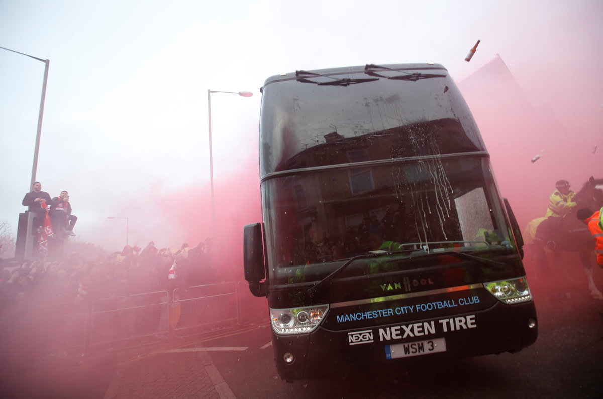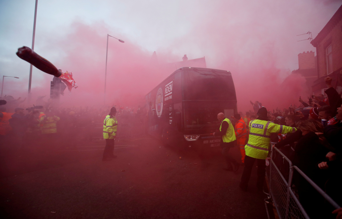 Soccer Football - Champions League Quarter Final First Leg - Liverpool vs Manchester City - Anfield, Liverpool, Britain - April 4, 2018 Liverpool fans set off flares and throw missiles at the Manchester City team bus outside the stadium before the match Action Images via Reuters/Carl RecineSoccer Football - Champions League Quarter Final First Leg - Liverpool vs Manchester City - Anfield, Liverpool, Britain - April 4, 2018 Liverpool fans react as the Manchester City team bus approaches the stadium before the match Action Images via Reuters/Carl Recine