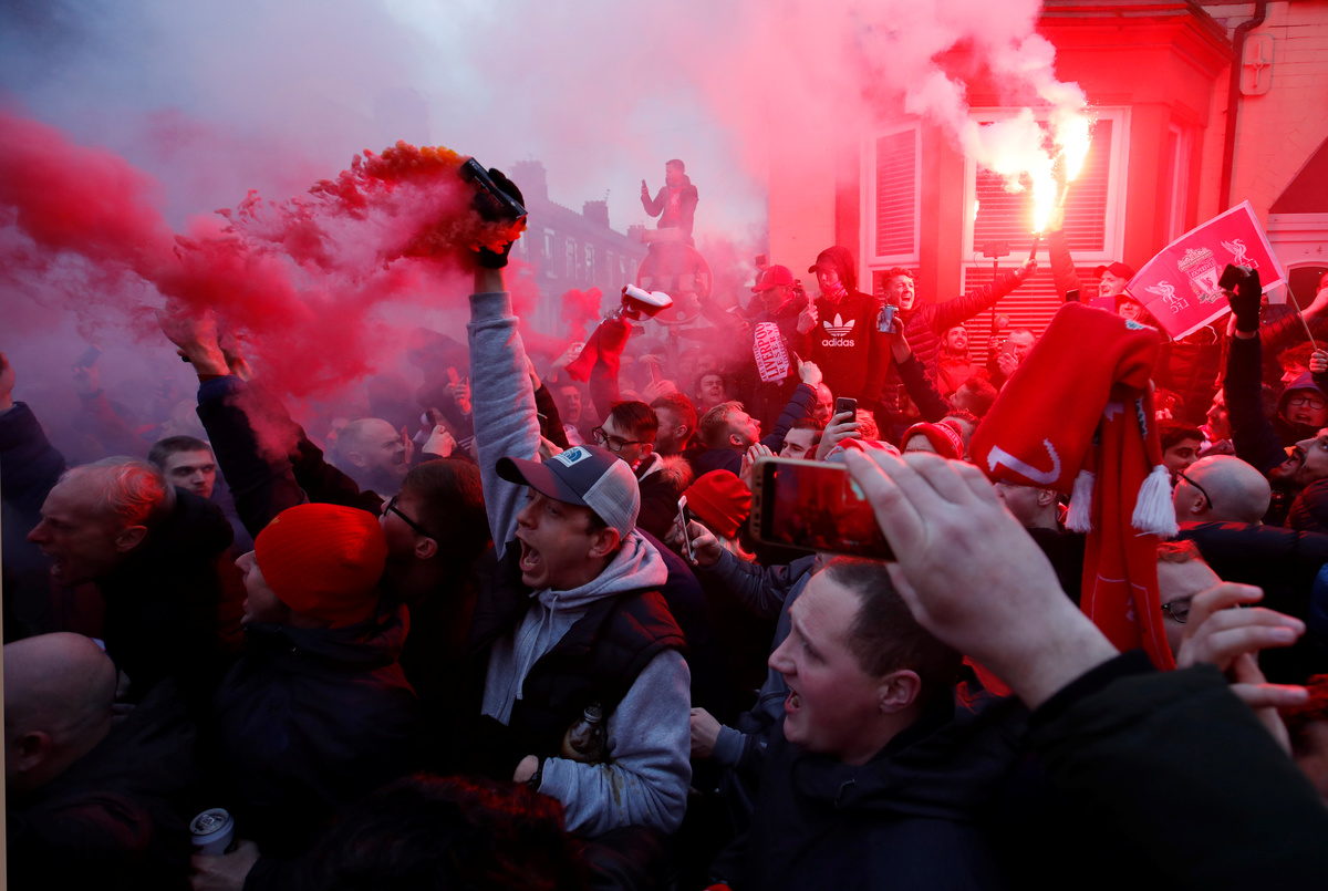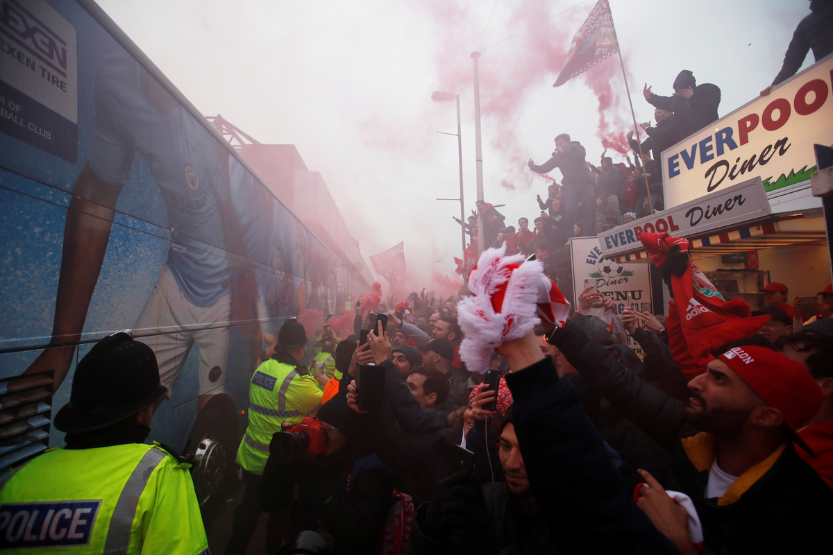 Soccer Football - Champions League Quarter Final First Leg - Liverpool vs Manchester City - Anfield, Liverpool, Britain - April 4, 2018 Liverpool fans set off flares and throw missiles at the Manchester City team bus outside the stadium before the match Action Images via Reuters/Carl RecineSoccer Football - Champions League Quarter Final First Leg - Liverpool vs Manchester City - Anfield, Liverpool, Britain - April 4, 2018 Liverpool fans outside the stadium before the match Action Images via Reuters/Carl Recine