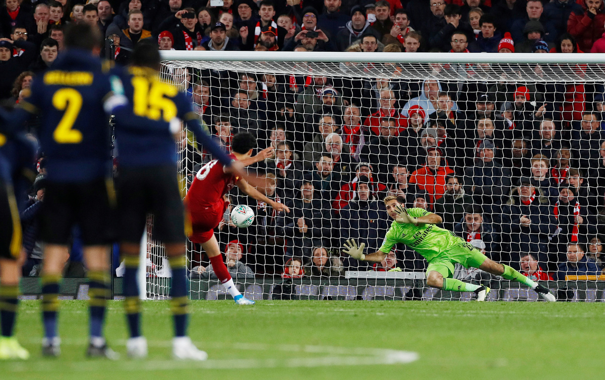 LIVERPOOL, England (Reuters) - Anfield debutant Curtis Jones scored the winning spot-kick as Liverpool beat Arsenal on penalties after an astonishing 5-5 draw to reach the League Cup quarter-finals on Wednesday.