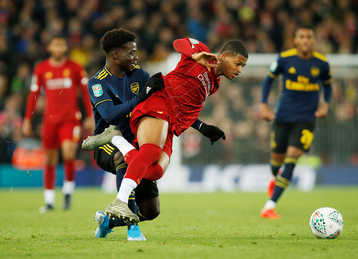 Soccer Football - Carabao Cup - Fourth Round - Liverpool v Arsenal - Anfield, Liverpool, Britain - October 30, 2019 Arsenal's Bukayo Saka in action with Liverpool's Rhian Brewster REUTERS/Andrew Yates