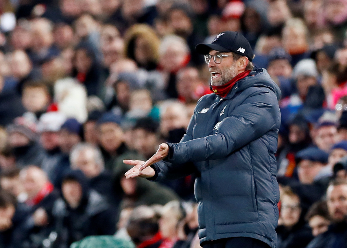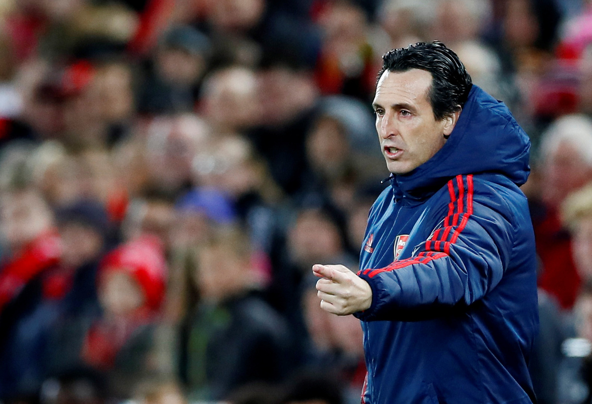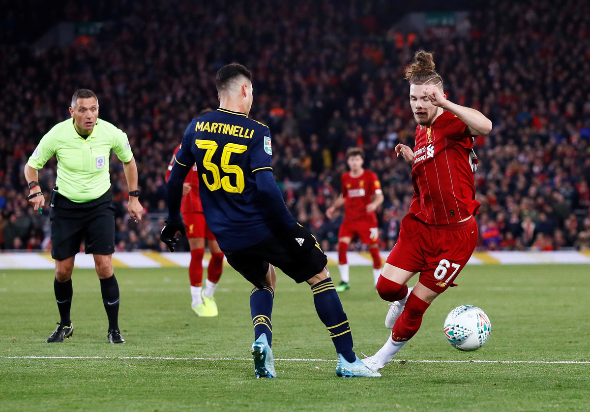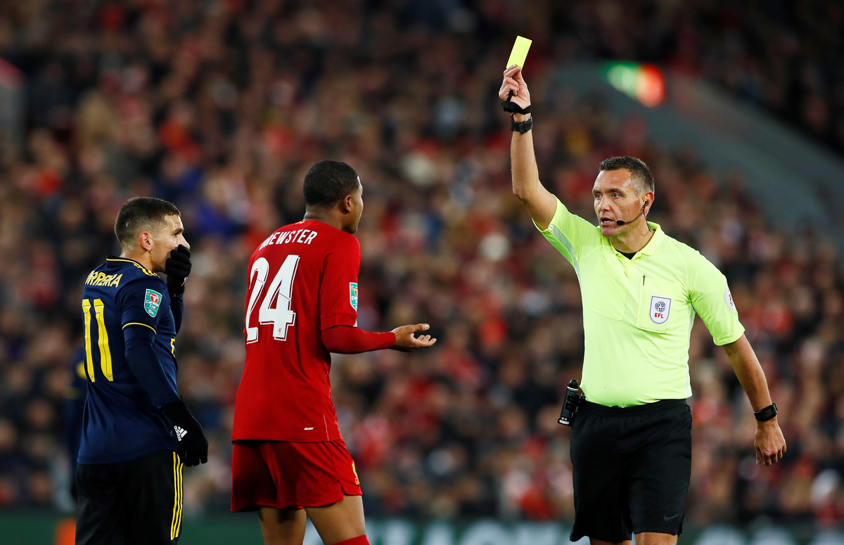 Soccer Football - Carabao Cup - Fourth Round - Liverpool v Arsenal - Anfield, Liverpool, Britain - October 30, 2019 Arsenal's Mesut Ozil in action with Liverpool's Harvey Elliott REUTERS/Andrew Yates Soccer Football - Carabao Cup - Fourth Round - Liverpool v Arsenal - Anfield, Liverpool, Britain - October 30, 2019 Arsenal's Ainsley Maitland-Niles in action with Liverpool's James Milner REUTERS/Andrew Yates Soccer Football - Carabao Cup - Fourth Round - Liverpool v Arsenal - Anfield, Liverpool, Britain - October 30, 2019 Liverpool's Rhian Brewster is shown a yellow card by referee Andre Marriner Action Images via Reuters/Jason Cairnduff Soccer Football - Carabao Cup - Fourth Round - Liverpool v Arsenal - Anfield, Liverpool, Britain - October 30, 2019 Liverpool's Divock Origi in action with Arsenal's Ainsley Maitland-Niles Action Images via Reuters/Jason Cairnduff Soccer Football - Carabao Cup - Fourth Round - Liverpool v Arsenal - Anfield, Liverpool, Britain - October 30, 2019 Liverpool manager Juergen Klopp reacts Action Images via Reuters/Jason Cairnduff Soccer Football - Carabao Cup - Fourth Round - Liverpool v Arsenal - Anfield, Liverpool, Britain - October 30, 2019 Arsenal manager Unai Emery Action Images via Reuters/Jason Cairnduff