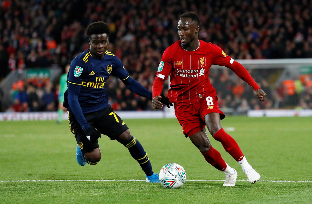 Soccer Football - Carabao Cup - Fourth Round - Liverpool v Arsenal - Anfield, Liverpool, Britain - October 30, 2019 Liverpool's Naby Keita in action with Arsenal's Bukayo Saka Action Images via Reuters/Jason Cairnduff