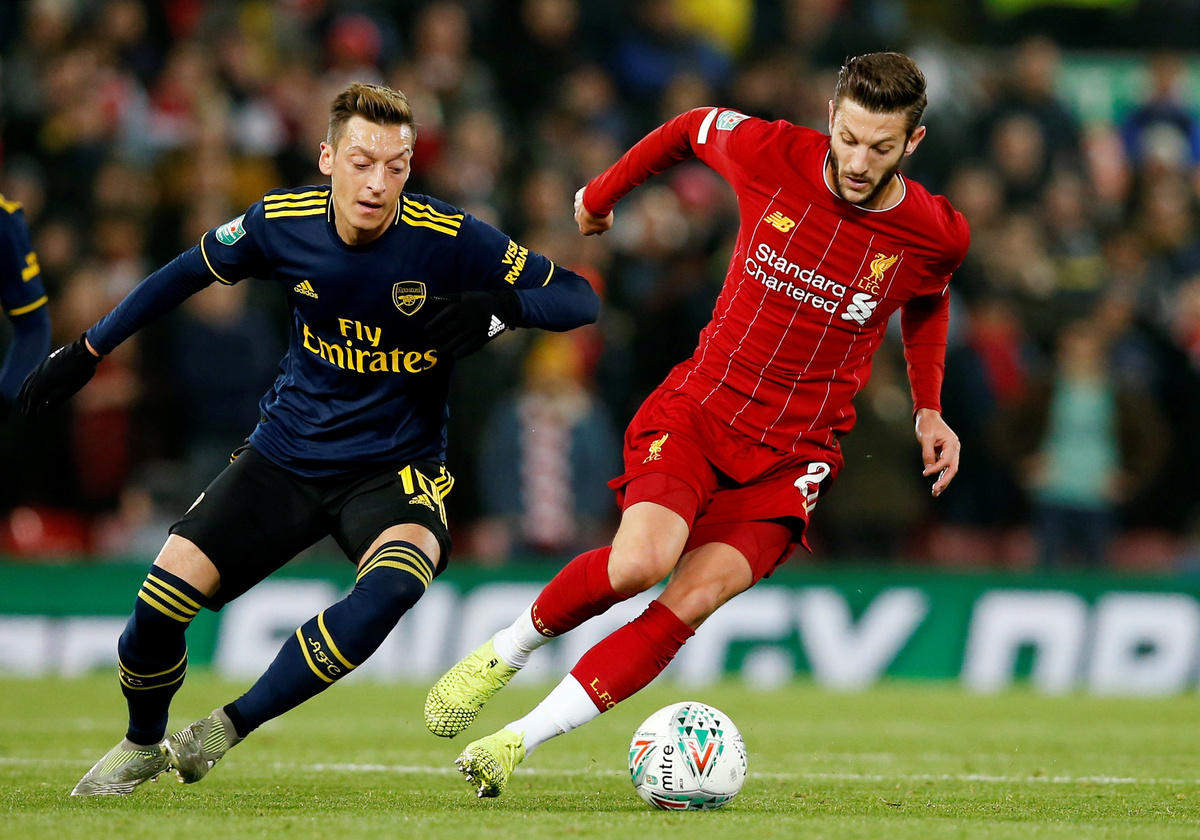 Soccer Football - Carabao Cup - Fourth Round - Liverpool v Arsenal - Anfield, Liverpool, Britain - October 30, 2019 Liverpool's Adam Lallana in action with Arsenal's Mesut Ozil REUTERS/Andrew Yates EDITORIAL USE ONLY. No use with unauthorized audio, video, data, fixture lists, club/league logos or "live" services. Online in-match use limited to 75 images, no video emulation. No use in betting, games or single club/league/player publications. Please contact your account representative for further details.
