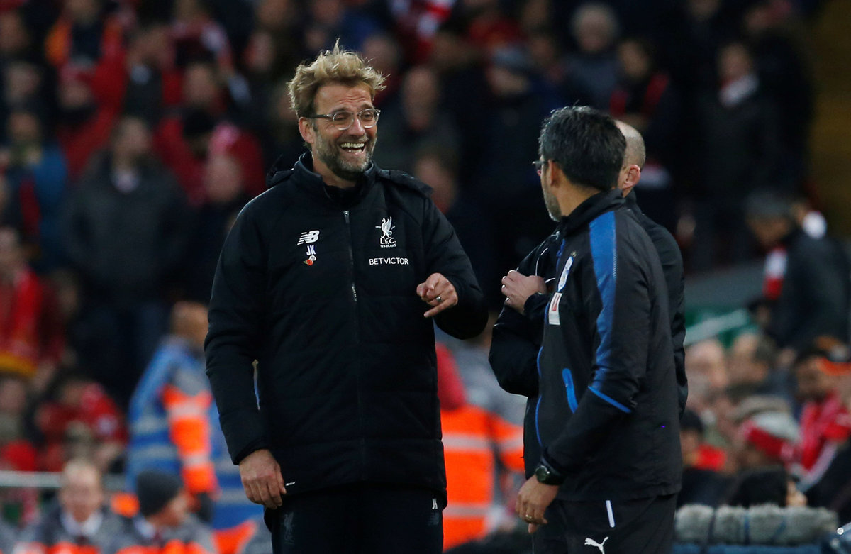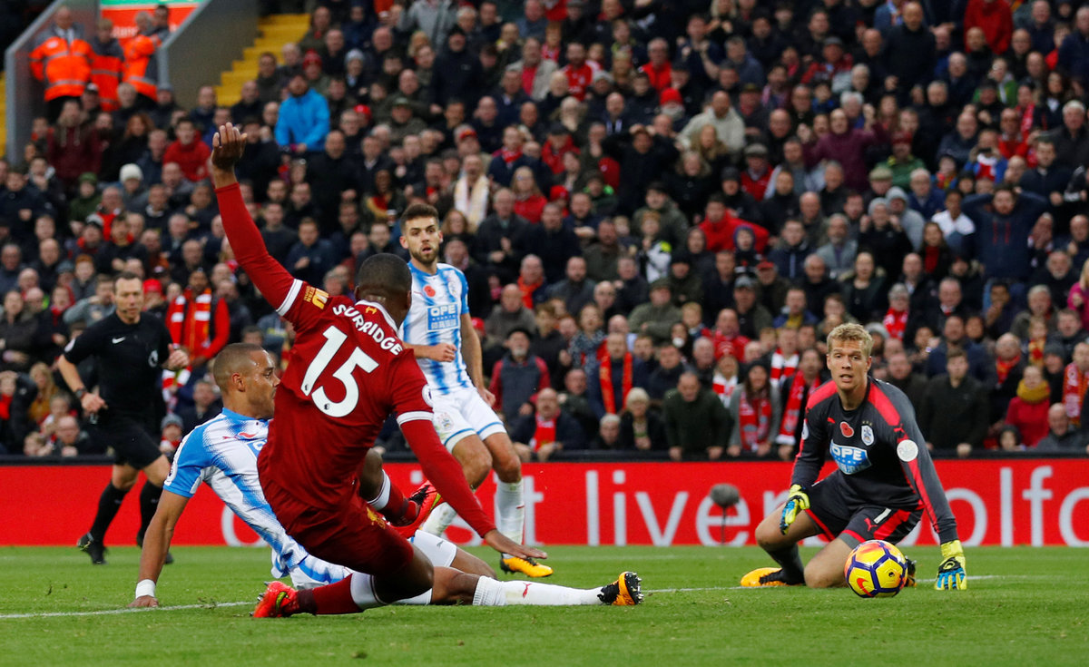 Soccer Football - Premier League - Liverpool vs Huddersfield Town - Anfield, Liverpool, Britain - October 28, 2017 Liverpool's Daniel Sturridge celebrates scoring their first goal REUTERS/Phil Noble Soccer Football - Premier League - Liverpool vs Huddersfield Town - Anfield, Liverpool, Britain - October 28, 2017 Liverpool's Joe Gomez in action REUTERS/Phil Noble Soccer Football - Premier League - Liverpool vs Huddersfield Town - Anfield, Liverpool, Britain - October 28, 2017 Liverpool's Simon Mignolet celebrates their second goal Action Images via Reuters/Craig Brough Soccer Football - Premier League - Liverpool vs Huddersfield Town - Anfield, Liverpool, Britain - October 28, 2017 Liverpool manager Juergen Klopp reacts Action Images via Reuters/Craig Brough Soccer Football - Premier League - Liverpool vs Huddersfield Town - Anfield, Liverpool, Britain - October 28, 2017 Liverpool's Roberto Firmino celebrates scoring their second goal with Jordan Henderson and team mates Action Images via Reuters/Craig Brough Soccer Football - Premier League - Liverpool vs Huddersfield Town - Anfield, Liverpool, Britain - October 28, 2017 Liverpool manager Juergen Klopp and Huddersfield Town manager David Wagner share a joke during the match Action Images via Reuters/Craig Brough Soccer Football - Premier League - Liverpool vs Huddersfield Town - Anfield, Liverpool, Britain - October 28, 2017 Liverpool manager Juergen Klopp celebrates with Jordan Henderson at the end of the match REUTERS/Phil Noble Soccer Football - Premier League - Liverpool vs Huddersfield Town - Anfield, Liverpool, Britain - October 28, 2017 Huddersfield Town manager David Wagner with Elias Kachunga and Christopher Schindler at the end of the match Action Images via Reuters/Craig Brough