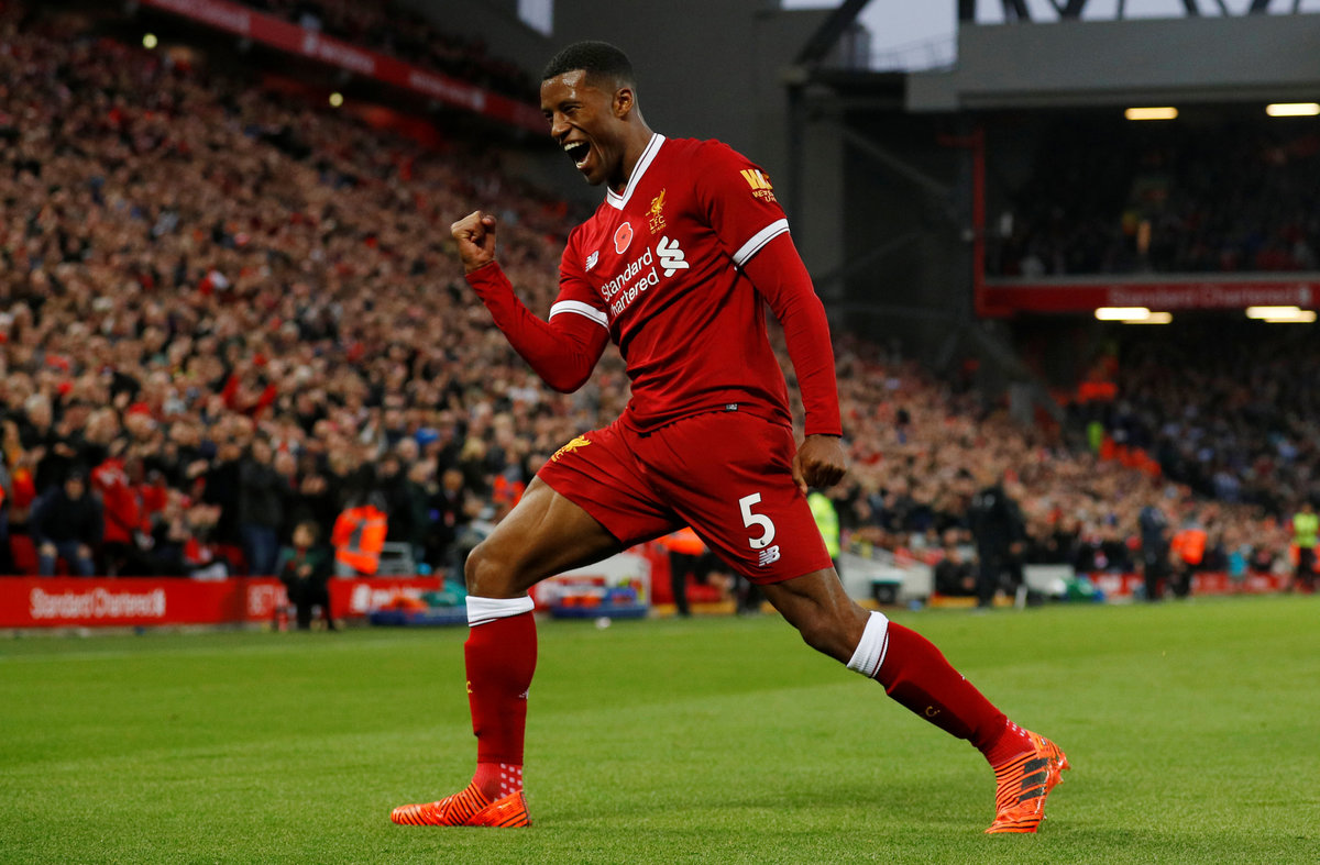 Soccer Football - Premier League - Liverpool vs Huddersfield Town - Anfield, Liverpool, Britain - October 28, 2017 Liverpool's Georginio Wijnaldum scores their third goal REUTERS/Phil Noble
