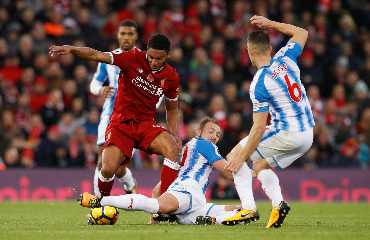 Soccer Football - Premier League - Liverpool vs Huddersfield Town - Anfield, Liverpool, Britain - October 28, 2017 Liverpool's Joe Gomez in action with Huddersfield Town’s Laurent Depoitre and Jonathan Hogg REUTERS/Phil Noble