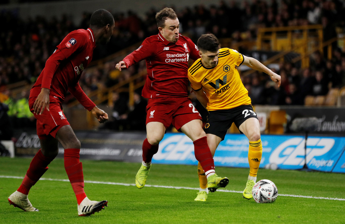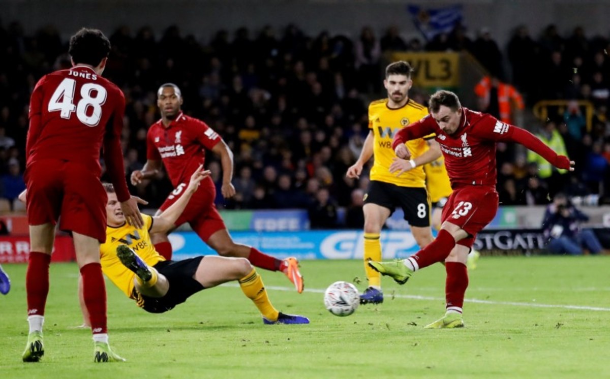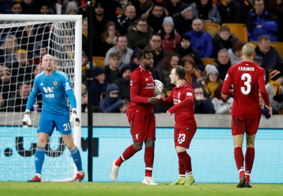 Soccer Football - FA Cup Third Round - Wolverhampton Wanderers v Liverpool - Molineux Stadium, Wolverhampton, Britain - January 7, 2019 Liverpool's Divock Origi celebrates scoring their first goal with Xherdan Shaqiri as Wolverhampton Wanderers' John Ruddy reacts Action Images via Reuters/Carl RecineSoccer Football - FA Cup Third Round - Wolverhampton Wanderers v Liverpool - Molineux Stadium, Wolverhampton, Britain - January 7, 2019 Wolverhampton Wanderers' Raul Jimenez in action with Liverpool's Ki-Jana Hoever and Simon Mignolet Action Images via Reuters/Carl RecineSoccer Football - FA Cup Third Round - Wolverhampton Wanderers v Liverpool - Molineux Stadium, Wolverhampton, Britain - January 7, 2019 Wolverhampton Wanderers manager Nuno Espirito Santo and Wolverhampton Wanderers' Ruben Neves celebrate after the match REUTERS/Darren StaplesSoccer Football - FA Cup Third Round - Wolverhampton Wanderers v Liverpool - Molineux Stadium, Wolverhampton, Britain - January 7, 2019 Liverpool's Xherdan Shaqiri in action with Wolverhampton Wanderers' Ruben Vinagre REUTERS/Darren StaplesSoccer Football - FA Cup Third Round - Wolverhampton Wanderers v Liverpool - Molineux Stadium, Wolverhampton, Britain - January 7, 2019 Wolverhampton Wanderers' John Ruddy celebrates their first goal scored by Raul Jimenez Action Images via Reuters/Carl RecineSoccer Football - FA Cup Third Round - Wolverhampton Wanderers v Liverpool - Molineux Stadium, Wolverhampton, Britain - January 7, 2019 Liverpool's Xherdan Shaqiri shoots at goal Action Images via Reuters/Carl RecineSoccer Football - FA Cup Third Round - Wolverhampton Wanderers v Liverpool - Molineux Stadium, Wolverhampton, Britain - January 7, 2019 Wolverhampton Wanderers' Willy Boly in action with Liverpool's Divock Origi Action Images via Reuters/Carl RecineSoccer Football - FA Cup Third Round - Wolverhampton Wanderers v Liverpool - Molineux Stadium, Wolverhampton, Britain - January 7, 2019 Liverpool's Ki-Jana Hoever in action with Wolverhampton Wanderers' Diogo Jota REUTERS/Darren StaplesSoccer Football - FA Cup Third Round - Wolverhampton Wanderers v Liverpool - Molineux Stadium, Wolverhampton, Britain - January 7, 2019 Liverpool's Xherdan Shaqiri in action with Wolverhampton Wanderers' Leander Dendoncker Action Images via Reuters/Carl RecineSoccer Football - FA Cup Third Round - Wolverhampton Wanderers v Liverpool - Molineux Stadium, Wolverhampton, Britain - January 7, 2019 Liverpool's Naby Keita in action with Wolverhampton Wanderers' Joao Moutinho Action Images via Reuters/Carl RecineSoccer Football - FA Cup Third Round - Wolverhampton Wanderers v Liverpool - Molineux Stadium, Wolverhampton, Britain - January 7, 2019 Liverpool's Ki-Jana Hoever speaks with Liverpool manager Juergen Klopp before he is substituted on Action Images via Reuters/Carl Recine