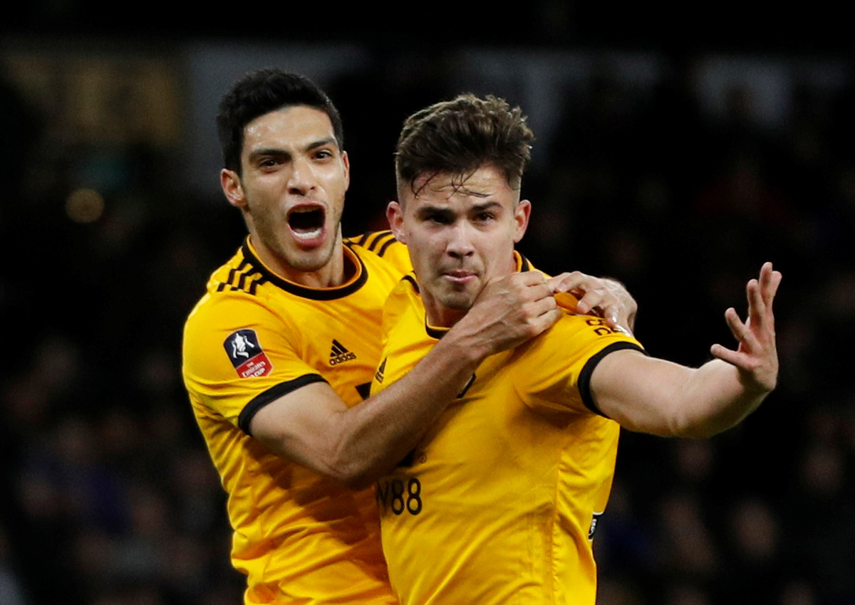 Soccer Football - FA Cup Third Round - Wolverhampton Wanderers v Liverpool - Molineux Stadium, Wolverhampton, Britain - January 7, 2019 Wolverhampton Wanderers' Raul Jimenez celebrates scoring their first goal with Leander Dendoncker REUTERS/Darren Staples