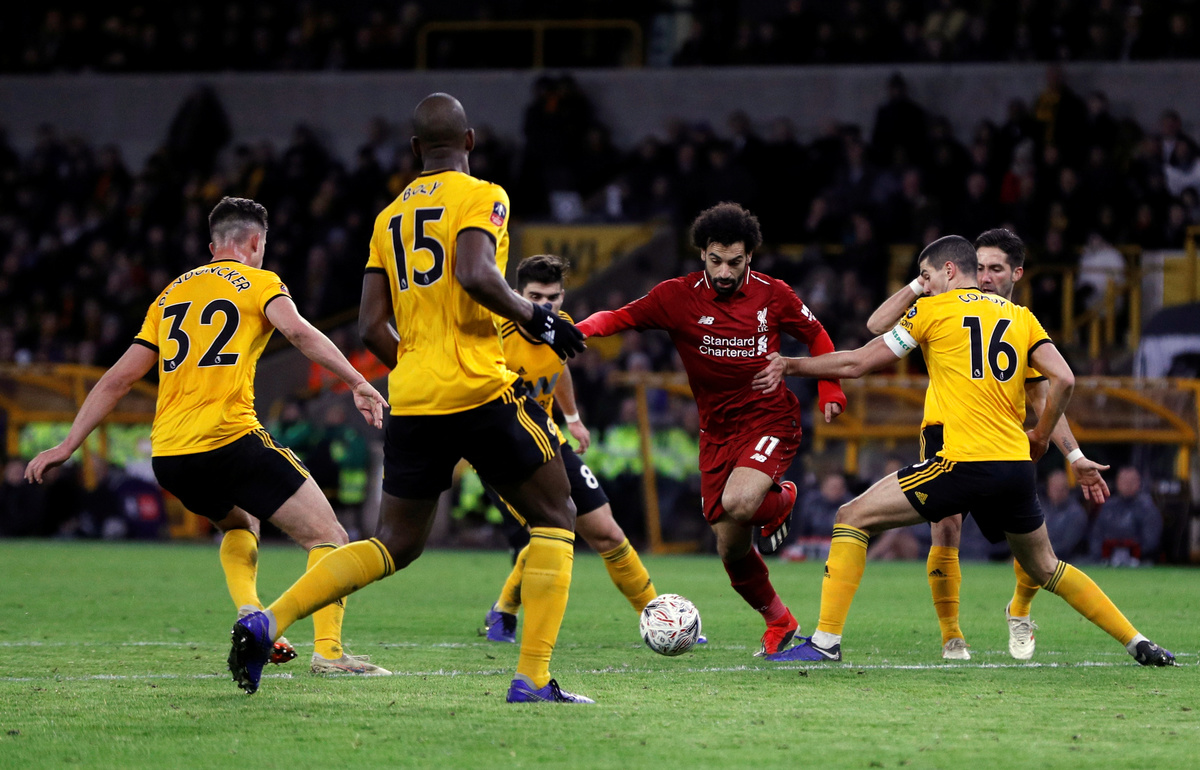 Soccer Football - FA Cup Third Round - Wolverhampton Wanderers v Liverpool - Molineux Stadium, Wolverhampton, Britain - January 7, 2019 Liverpool's Mohamed Salah in action with Wolverhampton Wanderers' Joao Moutinho, Conor Coady, Ruben Neves, Leander Dendoncker and Willy Boly REUTERS/Darren Staples