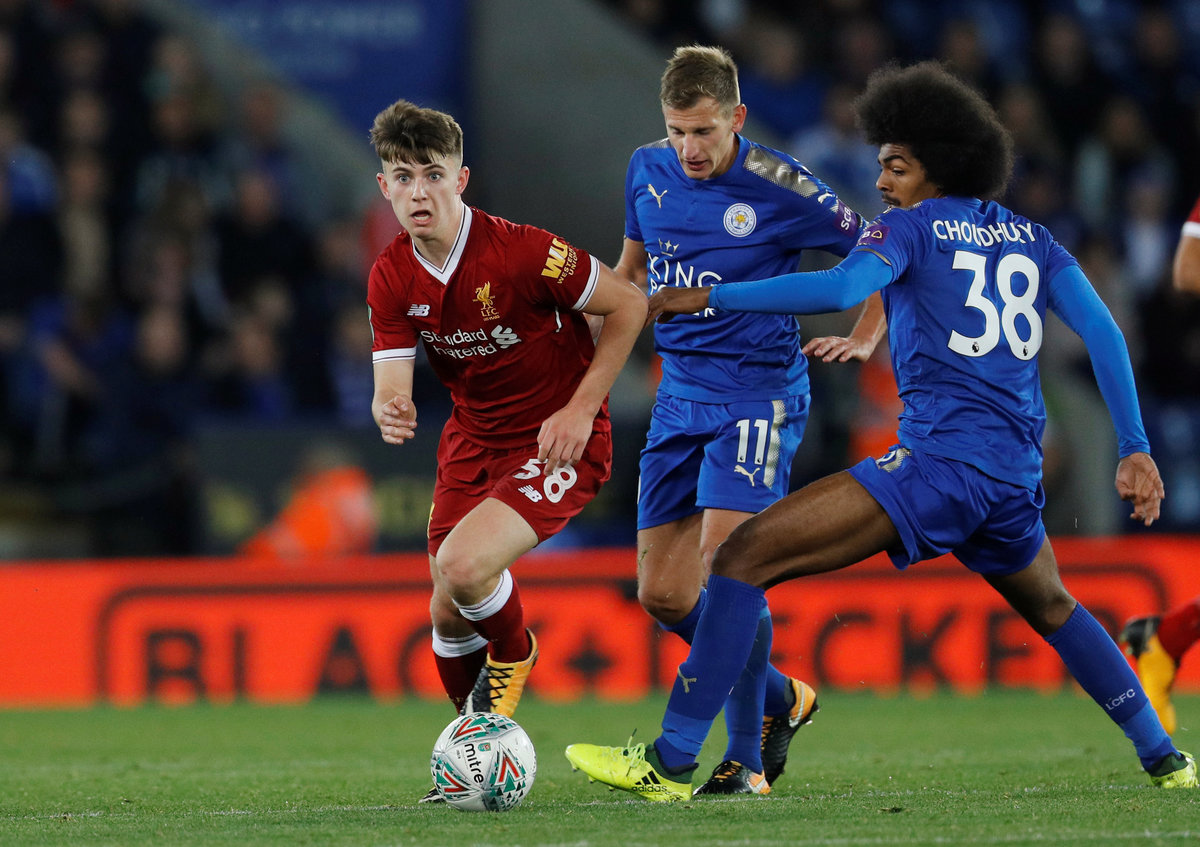 Soccer Football - Carabao Cup Third Round - Leicester City vs Liverpool - King Power Stadium, Leicester, Britain - September 19, 2017 Liverpool's Ben Woodburn in action with Leicester City's Marc Albrighton and Hamza Choudhury REUTERS/Darren Staples