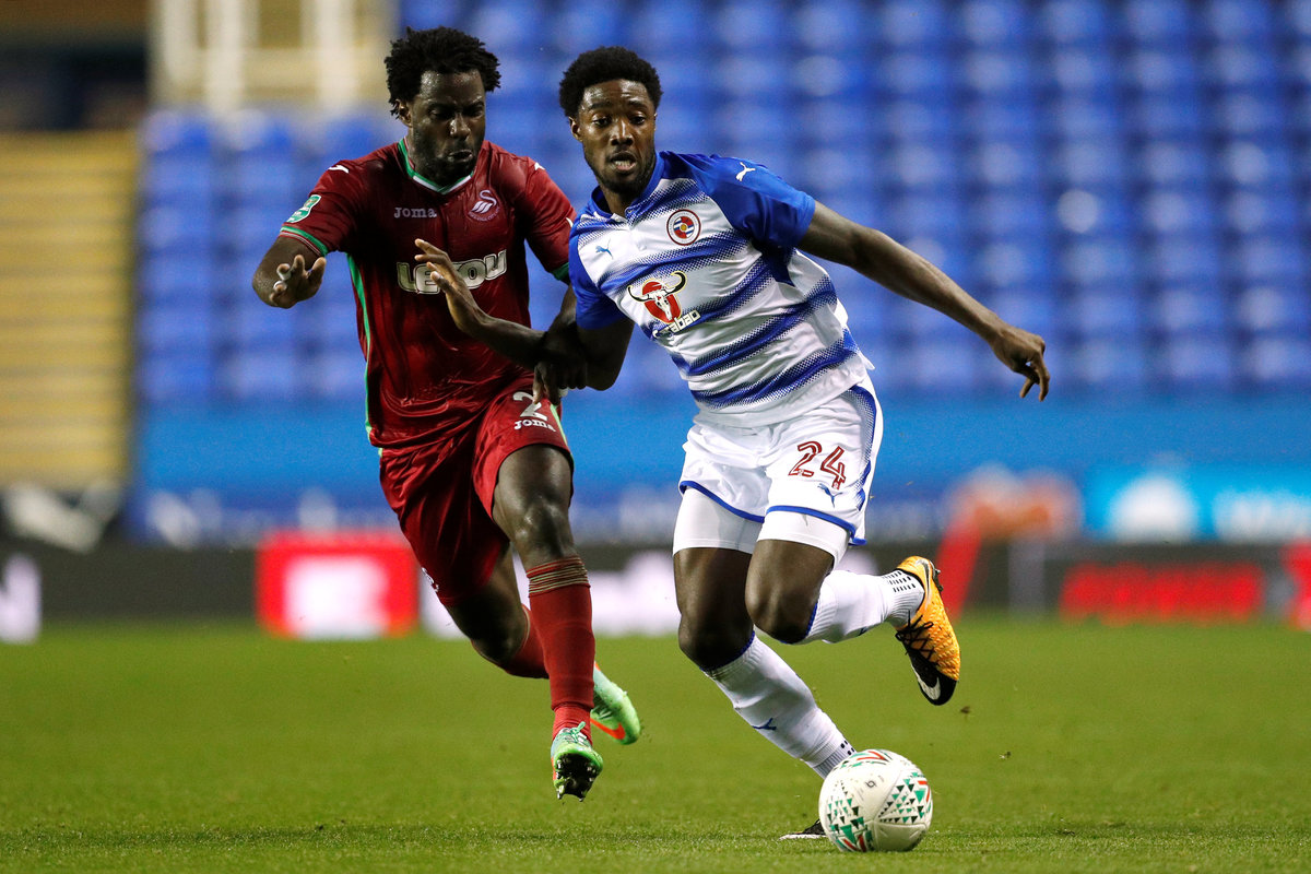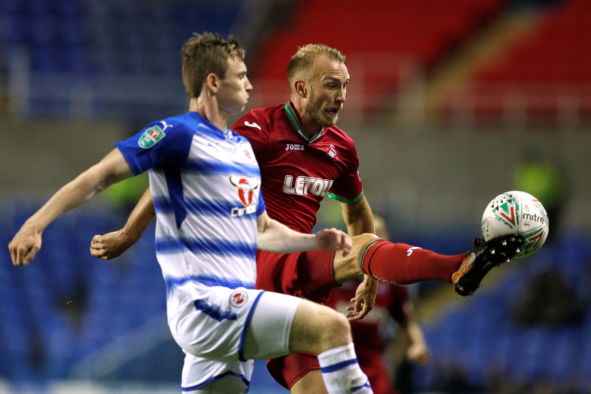 Soccer Football - Carabao Cup Third Round - Reading vs Swansea City - Madejski Stadium, Reading, Britain - September 19, 2017 Swansea City's Mike van der Hoorn in action with Reading's Jon Dadi Bodvarsson Action Images via Reuters/John Sibley
