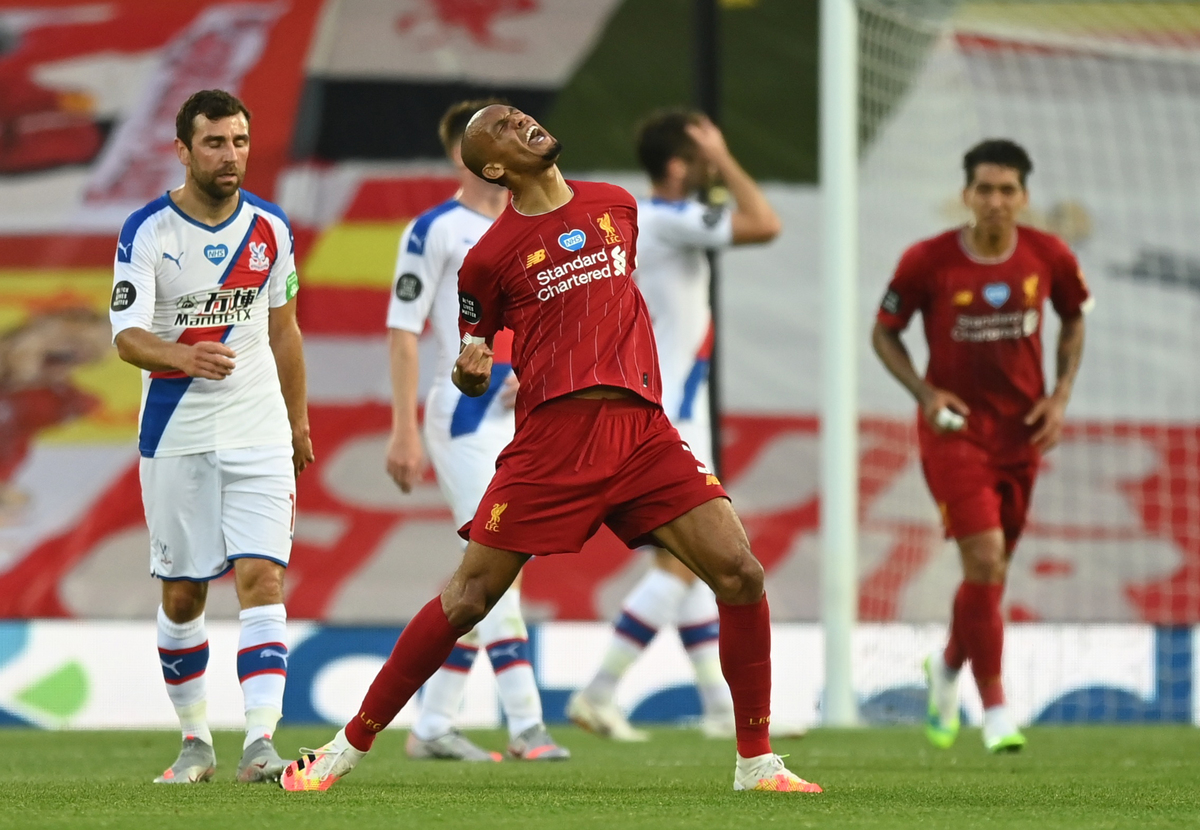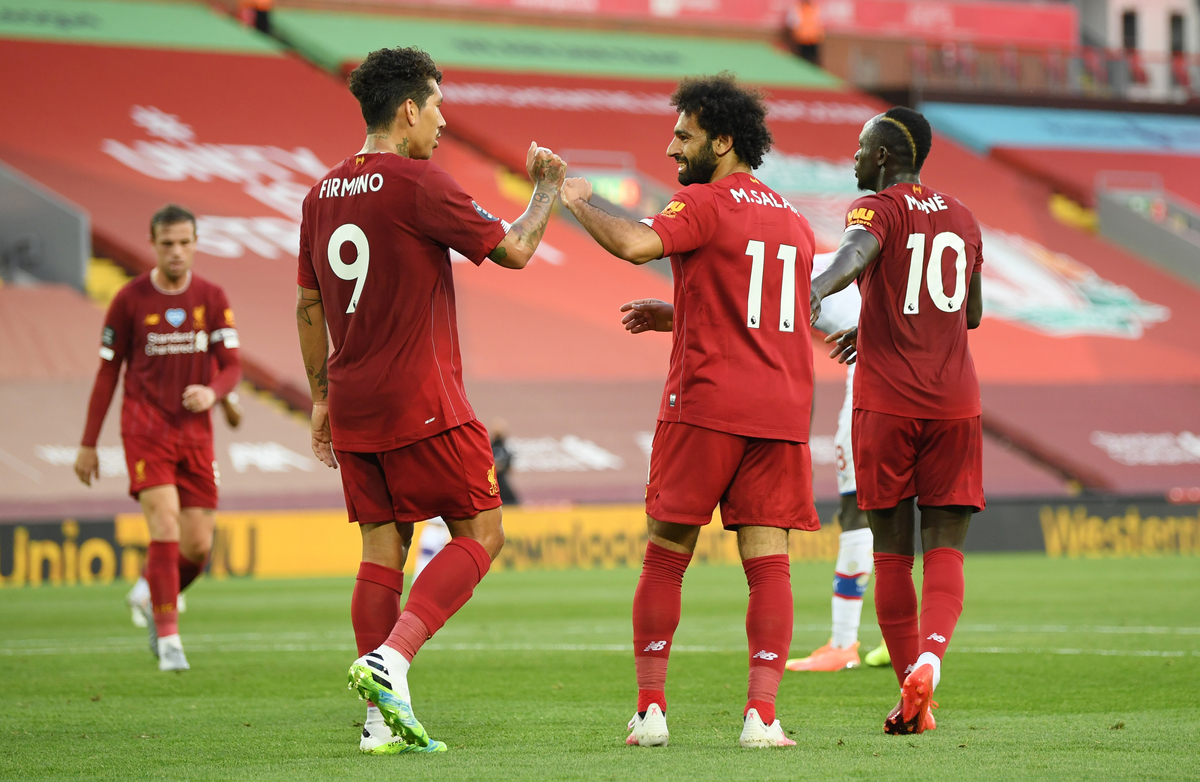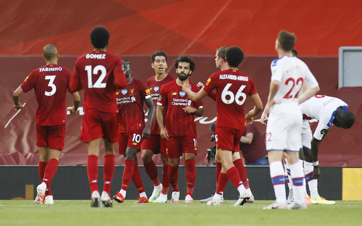 Soccer Football - Premier League - Liverpool v Crystal Palace - Anfield, Liverpool, Britain - June 24, 2020 Liverpool's Fabinho celebrates scoring their third goal with teammates, as play resumes behind closed doors following the outbreak of the coronavirus disease (COVID-19) REUTERS / Phil Noble / Pool Soccer Football - Premier League - Liverpool v Crystal Palace - Anfield, Liverpool, Britain - June 24, 2020 Liverpool manager Juergen Klopp shakes hands with Crystal Palace manager Roy Hodgson after the match as play resumes behind closed doors following the outbreak of the coronavirus disease (COVID-19) Shaun Botterill/Pool via REUTERS Soccer Football - Premier League - Liverpool v Crystal Palace - Anfield, Liverpool, Britain - June 24, 2020 Liverpool manager Juergen Klopp celebrates after the match as play resumes behind closed doors following the outbreak of the coronavirus disease (COVID-19) Shaun Botterill/Pool via REUTERS Soccer Football - Premier League - Liverpool v Crystal Palace - Anfield, Liverpool, Britain - June 24, 2020 Liverpool's Sadio Mane celebrates scoring their fourth goal, as play resumes behind closed doors following the outbreak of the coronavirus disease (COVID-19) REUTERS / Phil Noble / Pool Soccer Football - Premier League - Liverpool v Crystal Palace - Anfield, Liverpool, Britain - June 24, 2020 Liverpool's Sadio Mane scores their fourth goal, as play resumes behind closed doors following the outbreak of the coronavirus disease (COVID-19) REUTERS / Phil Noble / PoolSoccer Football - Premier League - Liverpool v Crystal Palace - Anfield, Liverpool, Britain - June 24, 2020 Crystal Palace's Gary Cahill in action with Liverpool's Georginio Wijnaldum as play resumes behind closed doors following the outbreak of the coronavirus disease (COVID-19) Shaun Botterill/Pool via REUTERS Soccer Football - Premier League - Liverpool v Crystal Palace - Anfield, Liverpool, Britain - June 24, 2020 Liverpool's Roberto Firmino in action with Crystal Palace's Jordan Ayew as play resumes behind closed doors following the outbreak of the coronavirus disease (COVID-19) Shaun Botterill/Pool via REUTERS Soccer Football - Premier League - Liverpool v Crystal Palace - Anfield, Liverpool, Britain - June 24, 2020 Liverpool's Mohamed Salah celebrates scoring their second goal with teammates as play resumes behind closed doors following the outbreak of the coronavirus disease (COVID-19) REUTERS / Phil Noble / Pool Soccer Football - Premier League - Liverpool v Crystal Palace - Anfield, Liverpool, Britain - June 24, 2020 Liverpool's Mohamed Salah celebrates scoring their second goal with Sadio Mane and Roberto Firmino as play resumes behind closed doors following the outbreak of the coronavirus disease (COVID-19) Shaun Botterill/Pool via REUTERS Soccer Football - Premier League - Liverpool v Crystal Palace - Anfield, Liverpool, Britain - June 24, 2020 Crystal Palace's Patrick van Aanholt in action with Liverpool's Fabinho as play resumes behind closed doors following the outbreak of the coronavirus disease (COVID-19) Shaun Botterill/Pool via REUTERS Soccer Football - Premier League - Liverpool v Crystal Palace - Anfield, Liverpool, Britain - June 24, 2020 Liverpool's Alex Oxlade-Chamberlain shoots at goal, as play resumes behind closed doors following the outbreak of the coronavirus disease (COVID-19) REUTERS / Phil Noble / Pool Soccer Football - Premier League - Liverpool v Crystal Palace - Anfield, Liverpool, Britain - June 24, 2020 Liverpool's Sadio Mane in action with Crystal Palace's Joel Ward, as play resumes behind closed doors following the outbreak of the coronavirus disease (COVID-19) REUTERS / Phil Noble / Pool