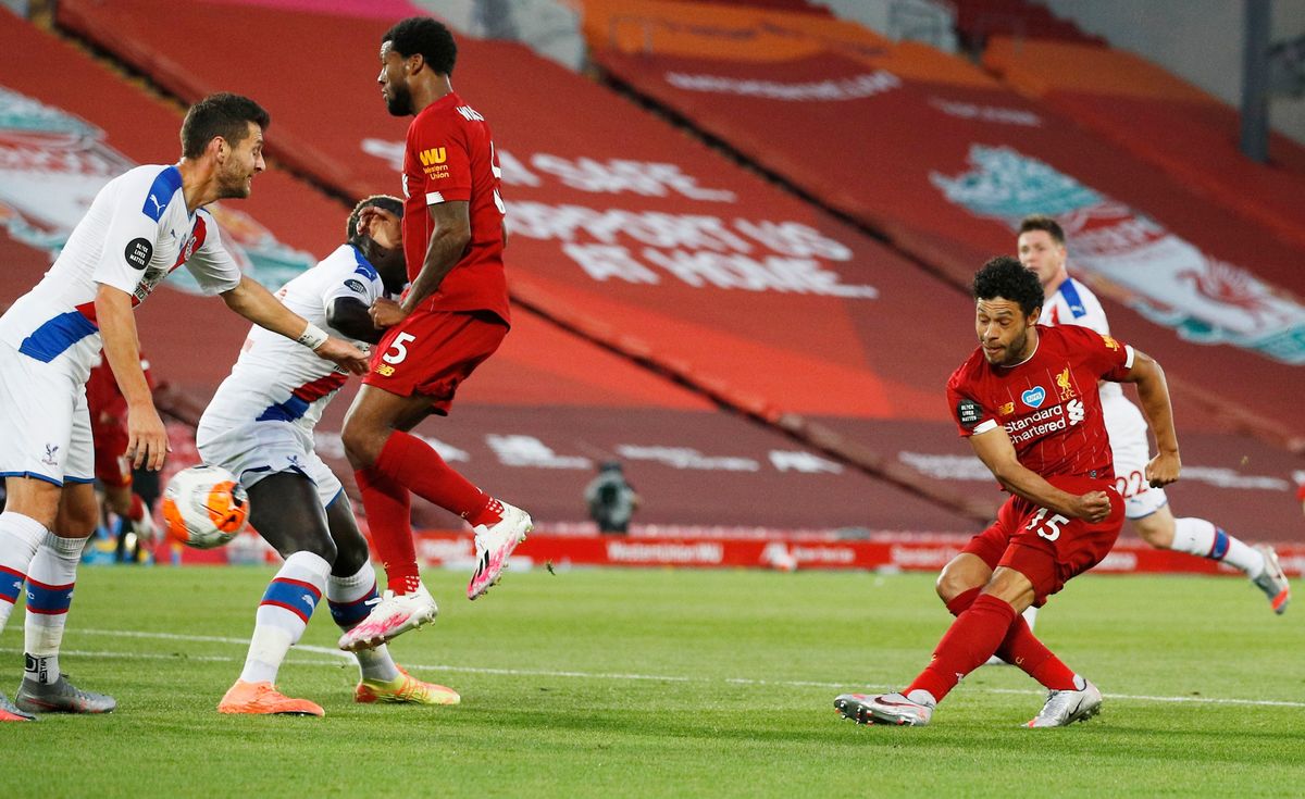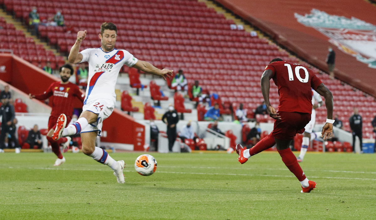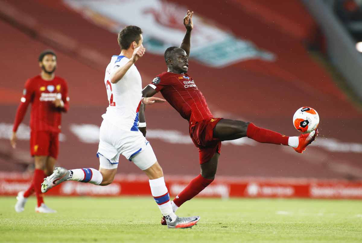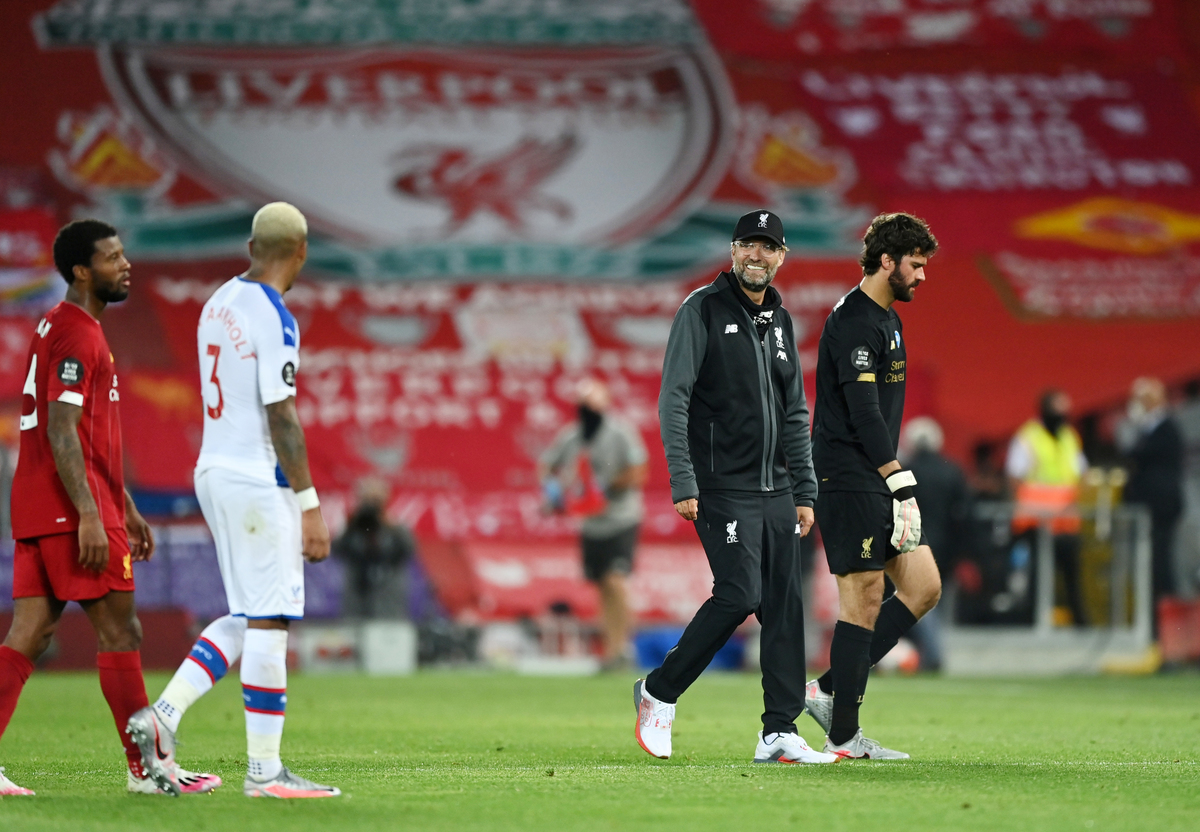 Soccer Football - Premier League - Liverpool v Crystal Palace - Anfield, Liverpool, Britain - June 24, 2020 Liverpool's Fabinho celebrates scoring their third goal with teammates, as play resumes behind closed doors following the outbreak of the coronavirus disease (COVID-19) REUTERS / Phil Noble / Pool Soccer Football - Premier League - Liverpool v Crystal Palace - Anfield, Liverpool, Britain - June 24, 2020 Liverpool manager Juergen Klopp shakes hands with Crystal Palace manager Roy Hodgson after the match as play resumes behind closed doors following the outbreak of the coronavirus disease (COVID-19) Shaun Botterill/Pool via REUTERS Soccer Football - Premier League - Liverpool v Crystal Palace - Anfield, Liverpool, Britain - June 24, 2020 Liverpool manager Juergen Klopp celebrates after the match as play resumes behind closed doors following the outbreak of the coronavirus disease (COVID-19) Shaun Botterill/Pool via REUTERS Soccer Football - Premier League - Liverpool v Crystal Palace - Anfield, Liverpool, Britain - June 24, 2020 Liverpool's Sadio Mane celebrates scoring their fourth goal, as play resumes behind closed doors following the outbreak of the coronavirus disease (COVID-19) REUTERS / Phil Noble / Pool Soccer Football - Premier League - Liverpool v Crystal Palace - Anfield, Liverpool, Britain - June 24, 2020 Liverpool's Sadio Mane scores their fourth goal, as play resumes behind closed doors following the outbreak of the coronavirus disease (COVID-19) REUTERS / Phil Noble / PoolSoccer Football - Premier League - Liverpool v Crystal Palace - Anfield, Liverpool, Britain - June 24, 2020 Crystal Palace's Gary Cahill in action with Liverpool's Georginio Wijnaldum as play resumes behind closed doors following the outbreak of the coronavirus disease (COVID-19) Shaun Botterill/Pool via REUTERS Soccer Football - Premier League - Liverpool v Crystal Palace - Anfield, Liverpool, Britain - June 24, 2020 Liverpool's Roberto Firmino in action with Crystal Palace's Jordan Ayew as play resumes behind closed doors following the outbreak of the coronavirus disease (COVID-19) Shaun Botterill/Pool via REUTERS Soccer Football - Premier League - Liverpool v Crystal Palace - Anfield, Liverpool, Britain - June 24, 2020 Liverpool's Mohamed Salah celebrates scoring their second goal with teammates as play resumes behind closed doors following the outbreak of the coronavirus disease (COVID-19) REUTERS / Phil Noble / Pool Soccer Football - Premier League - Liverpool v Crystal Palace - Anfield, Liverpool, Britain - June 24, 2020 Liverpool's Mohamed Salah celebrates scoring their second goal with Sadio Mane and Roberto Firmino as play resumes behind closed doors following the outbreak of the coronavirus disease (COVID-19) Shaun Botterill/Pool via REUTERS Soccer Football - Premier League - Liverpool v Crystal Palace - Anfield, Liverpool, Britain - June 24, 2020 Crystal Palace's Patrick van Aanholt in action with Liverpool's Fabinho as play resumes behind closed doors following the outbreak of the coronavirus disease (COVID-19) Shaun Botterill/Pool via REUTERS Soccer Football - Premier League - Liverpool v Crystal Palace - Anfield, Liverpool, Britain - June 24, 2020 Liverpool's Alex Oxlade-Chamberlain shoots at goal, as play resumes behind closed doors following the outbreak of the coronavirus disease (COVID-19) REUTERS / Phil Noble / Pool Soccer Football - Premier League - Liverpool v Crystal Palace - Anfield, Liverpool, Britain - June 24, 2020 Liverpool's Sadio Mane in action with Crystal Palace's Joel Ward, as play resumes behind closed doors following the outbreak of the coronavirus disease (COVID-19) REUTERS / Phil Noble / Pool
