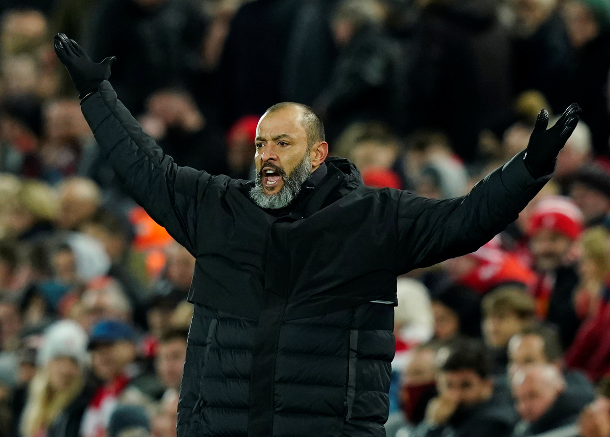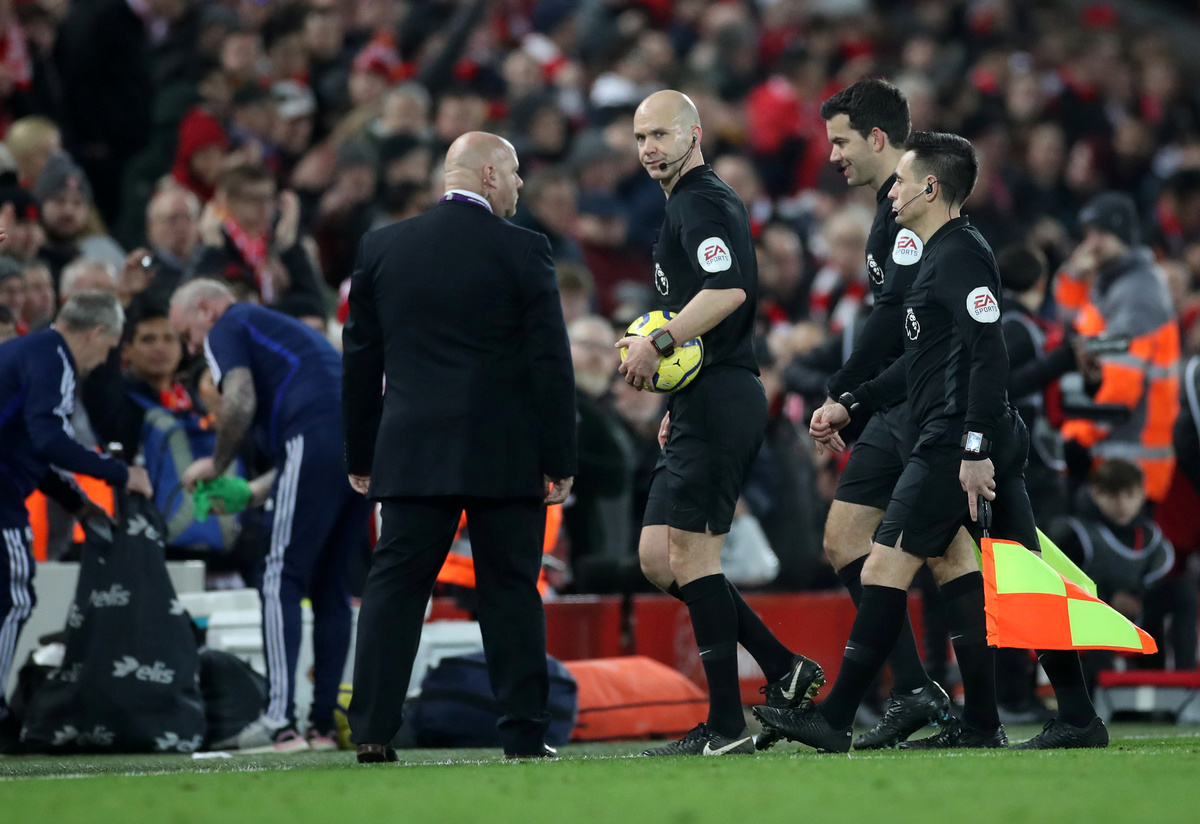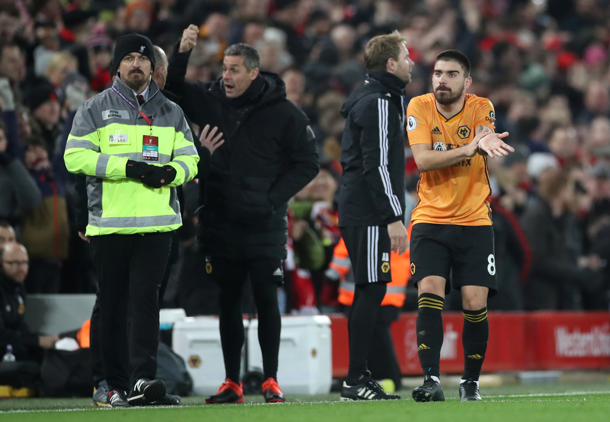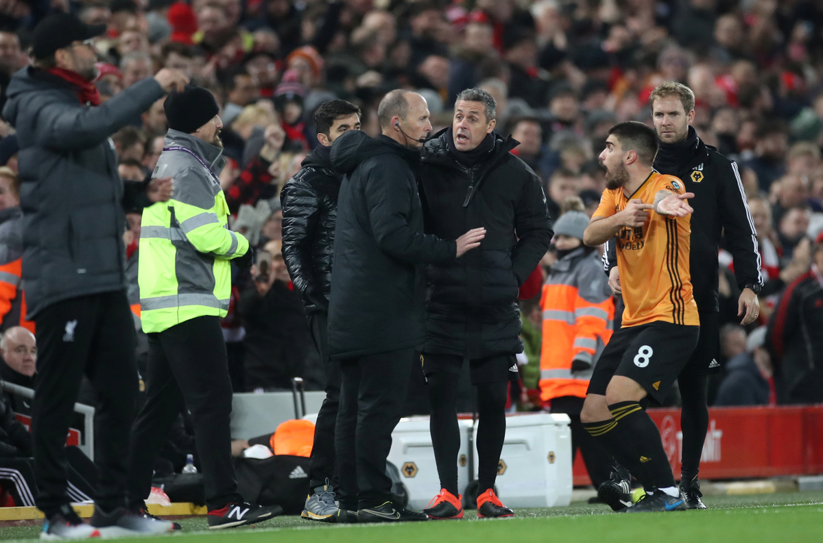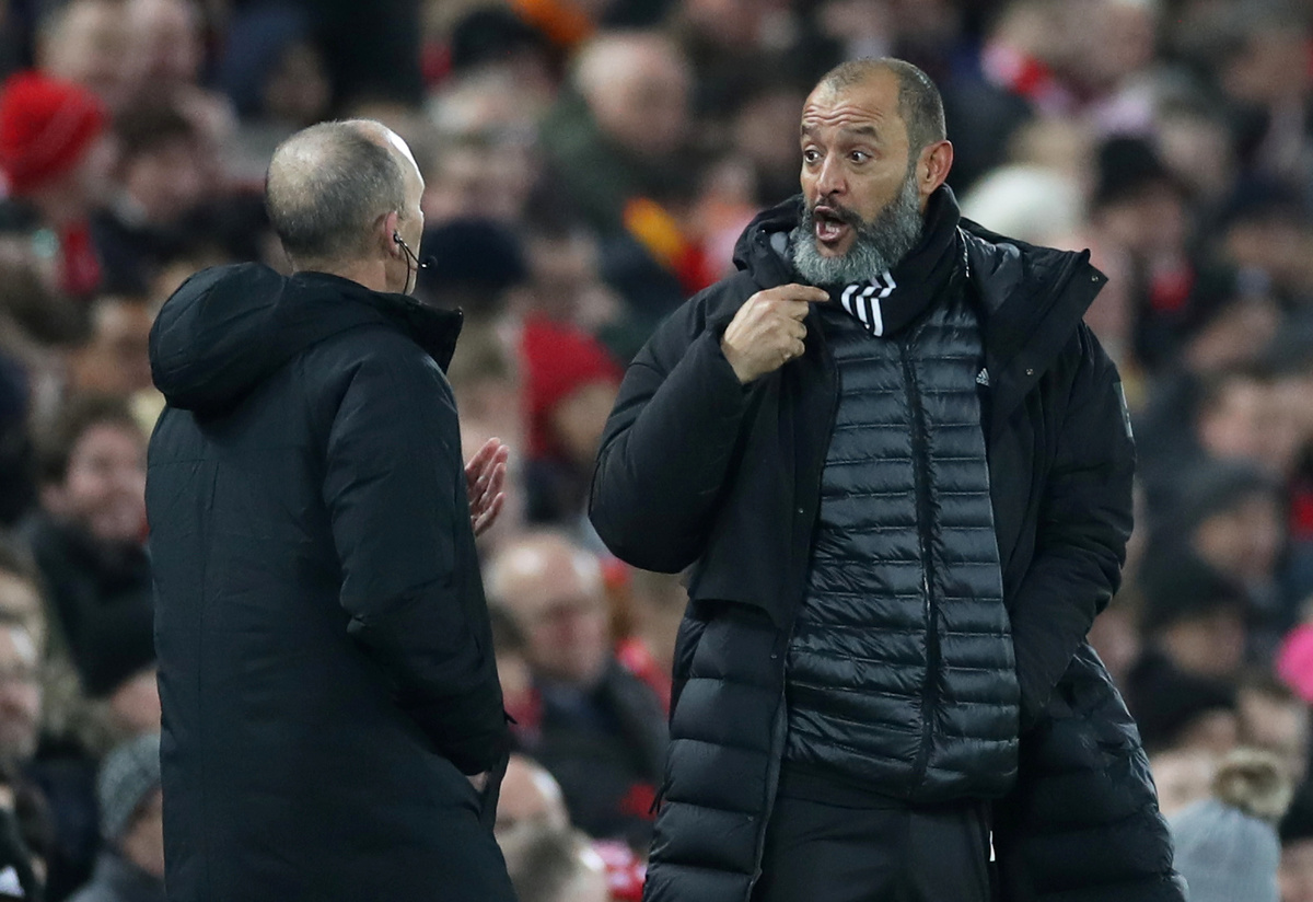 Soccer Football - Premier League - Liverpool v Wolverhampton Wanderers - Anfield, Liverpool, Britain - December 29, 2019 Wolverhampton Wanderers manager Nuno Espirito Santo reacts REUTERS/Andrew Yates Soccer Football - Premier League - Liverpool v Wolverhampton Wanderers - Anfield, Liverpool, Britain - December 29, 2019 Wolverhampton Wanderers manager Nuno Espirito Santo with the asssistant referee Action Images via Reuters/Carl Recine Soccer Football - Premier League - Liverpool v Wolverhampton Wanderers - Anfield, Liverpool, Britain - December 29, 2019 Wolverhampton Wanderers manager Nuno Espirito Santo with the asssistant referee Action Images via Reuters/Carl Recine Soccer Football - Premier League - Liverpool v Wolverhampton Wanderers - Anfield, Liverpool, Britain - December 29, 2019 Wolverhampton Wanderers' Ruben Neves appeals to the assistant referee Action Images via Reuters/Carl Recine Soccer Football - Premier League - Liverpool v Wolverhampton Wanderers - Anfield, Liverpool, Britain - December 29, 2019 Wolverhampton Wanderers' Ruben Neves appeals to the assistant referee Action Images via Reuters/Carl Recine Soccer Football - Premier League - Liverpool v Wolverhampton Wanderers - Anfield, Liverpool, Britain - December 29, 2019 Wolverhampton Wanderers' Raul Jimenez in action with Liverpool's Georginio Wijnaldum REUTERS/Andrew Yates ESoccer Football - Premier League - Liverpool v Wolverhampton Wanderers - Anfield, Liverpool, Britain - December 29, 2019 Referee Anthony Taylor and assistants walk off after the match Action Images via Reuters/Carl Recine
