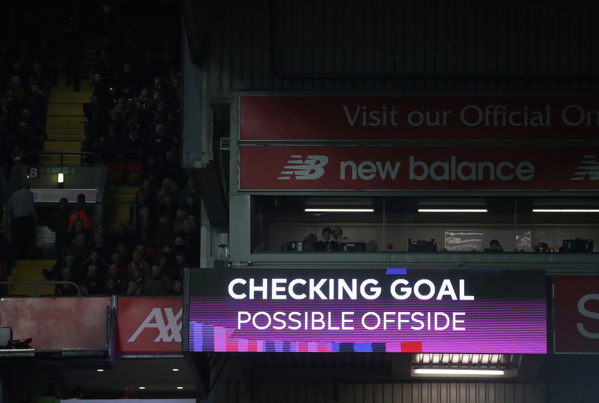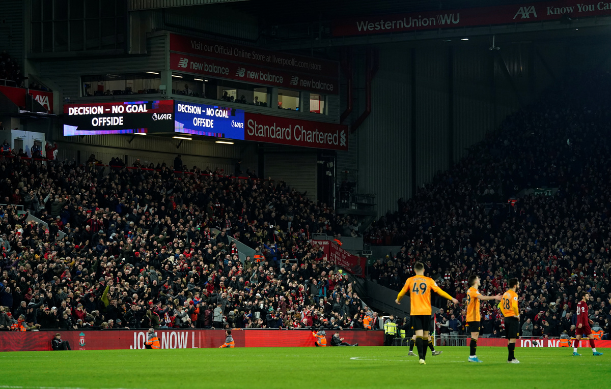 Soccer Football - Premier League - Liverpool v Wolverhampton Wanderers - Anfield, Liverpool, Britain - December 29, 2019 General view of the big screen after a Wolverhampton Wanderers goal is disallowed REUTERS/Andrew Yates