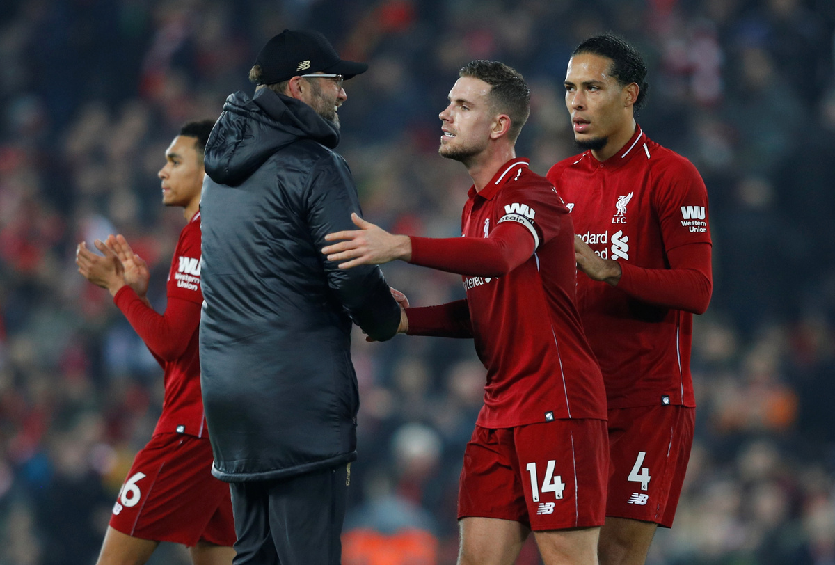 Soccer Football - Premier League - Liverpool v Newcastle United - Anfield, Liverpool, Britain - December 26, 2018 Liverpool's Jordan Henderson celebrates with manager Juergen Klopp and Virgil van Dijk at the end of the match REUTERS/Phil Noble