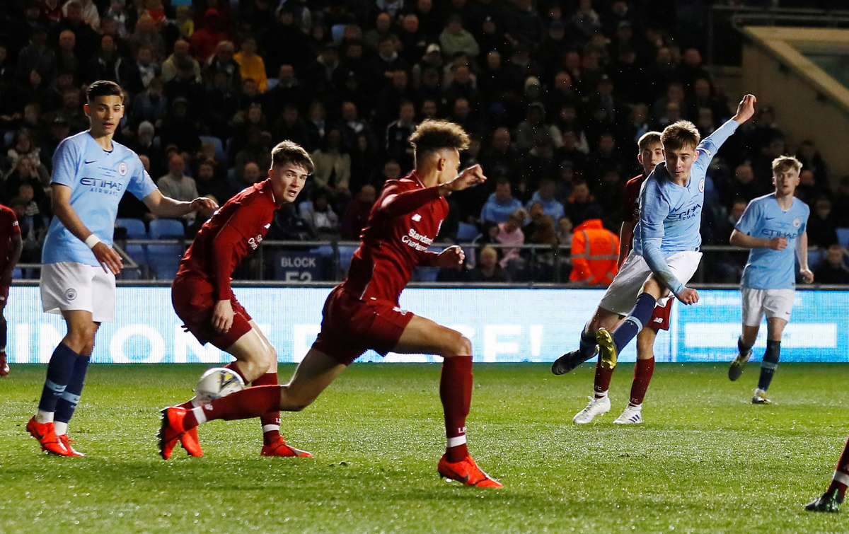 Soccer Football - FA Youth Cup Final - Manchester City v Liverpool - The Academy Stadium, Manchester, Britain - April 25, 2019 Manchester City's Benjamin Knight shoots at goal Action Images via Reuters/Jason Cairnduff