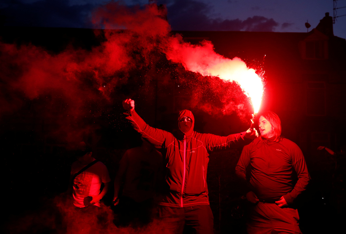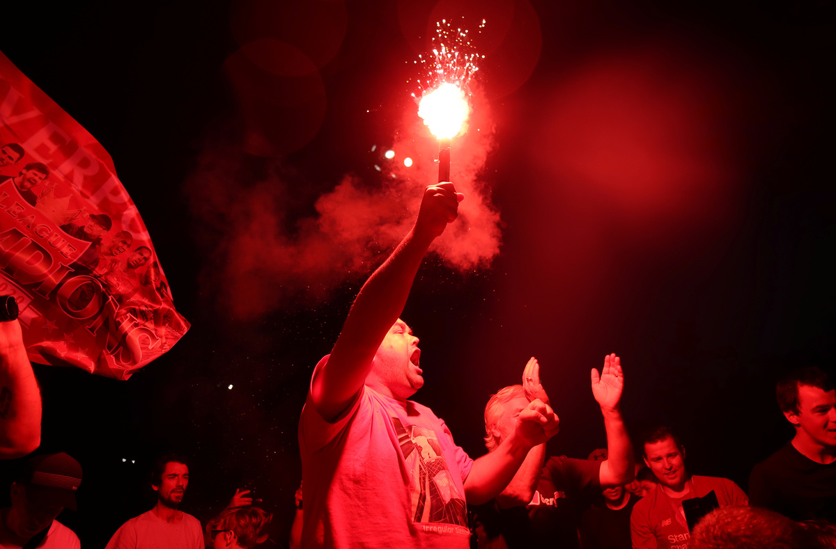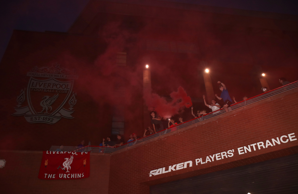 Soccer Football - Premier League - Liverpool fans celebrate winning the Premier League - Liverpool, Britain - June 25, 2020 Liverpool fans celebrate winning the Premier League with flares outside Anfield after Chelsea won their match against Manchester City REUTERS/Phil Noble