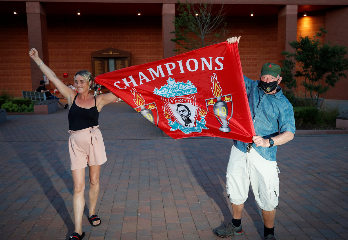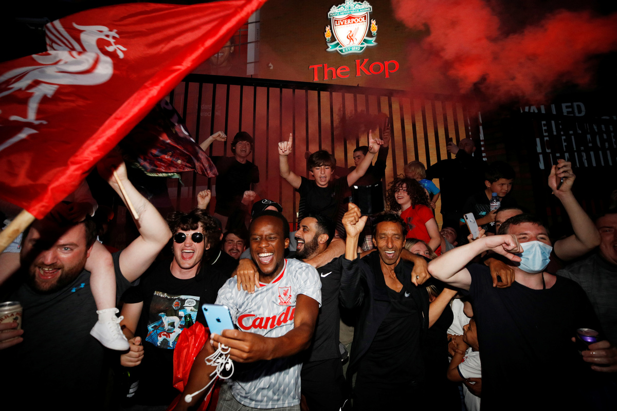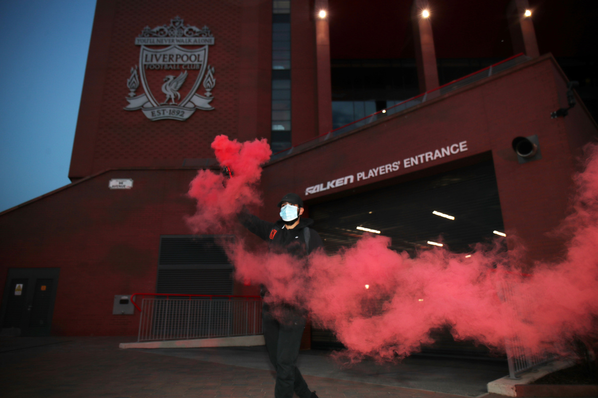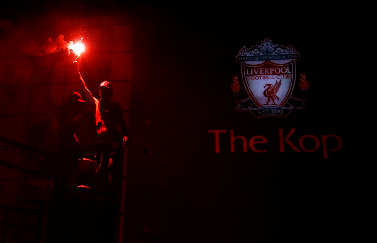 Soccer Football - Premier League - Liverpool could win Premier League if Manchester city drop points against Chelsea - Liverpool, Britain - June 25, 2020 Liverpool fans celebrate with flares outside Anfield after Chelsea scored their second goal in their match against Manchester City REUTERS/Phil Noble Soccer Football - Premier League - Liverpool fans celebrate winning the Premier League - Liverpool, Britain - June 25, 2020 Liverpool fans celebrate winning the Premier League outside Anfield with flares after Chelsea won their match against Manchester City Action Images via Reuters/Molly DarlingtonSoccer Football - Liverpool fans celebrate winning the Premier League - Liverpool, Britain - June 25, 2020 Liverpool fans celebrate winning the Premier League outside Anfield with flares after Chelsea won their match against Manchester City Action Images via Reuters/Carl RecineSoccer Football - Liverpool fans celebrate winning the Premier League - Liverpool, Britain - June 25, 2020 Liverpool fans celebrate winning the Premier League outside Anfield after Chelsea won their match against Manchester City Action Images via Reuters/Carl RecineSoccer Football - Premier League - Liverpool could win the Premier League if Manchester City drop points against Chelsea - Liverpool, Britain - June 25, 2020 Flags, scarves and cutout photos of Liverpool players, Liverpool manager Juergen Klopp and the Premier League trophy are seen outside the house of Liverpool fan Emily Farley Action Images via Reuters/Molly DarlingtonFILE PHOTO: Soccer Football - Champions League - Round of 16 Second Leg - Liverpool v Atletico Madrid - Anfield, Liverpool, Britain - March 11, 2020 Liverpool's Georginio Wijnaldum celebrates scoring their first goal Action Images via Reuters/Carl RecineFILE PHOTO: Soccer Football - Premier League - Liverpool v Crystal Palace - Anfield, Liverpool, Britain - June 24, 2020 Liverpool manager Juergen Klopp before the match, as play resumes behind closed doors following the outbreak of the coronavirus disease (COVID-19) Shaun Botterill/Pool via REUTERS