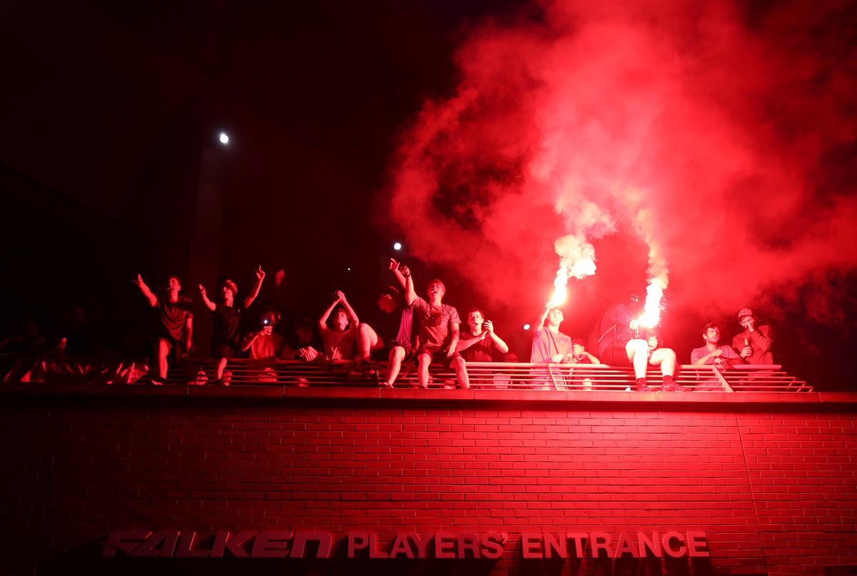 As the Chelsea game moved into stoppage time at an empty stadium in London, 350km away outside Anfield Liverpool fans began lighting red flares as the celebrations began in earnest.