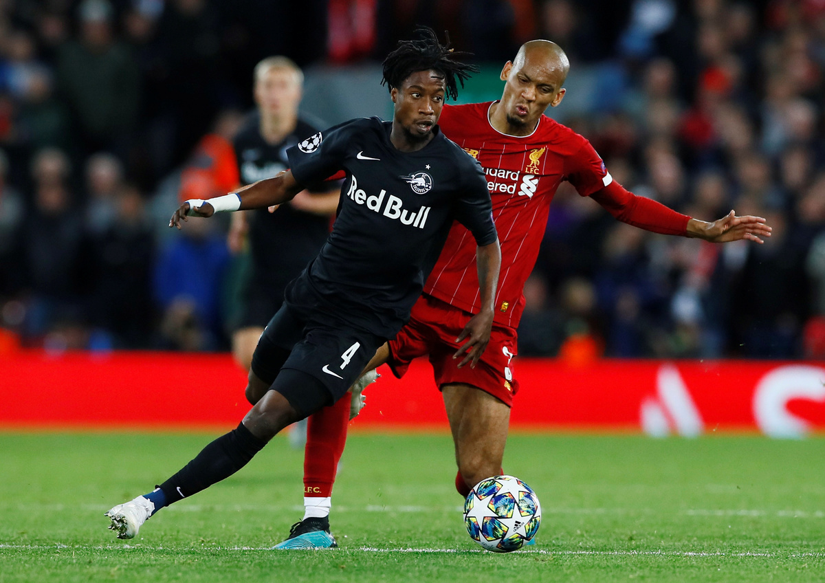 Soccer Football - Champions League - Group E - Liverpool v FC Salzburg - Anfield, Liverpool, Britain - October 2, 2019 FC Salzburg's Majeed Ashimeru in action with Liverpool's Fabinho Action Images via Reuters/Jason Cairnduff
