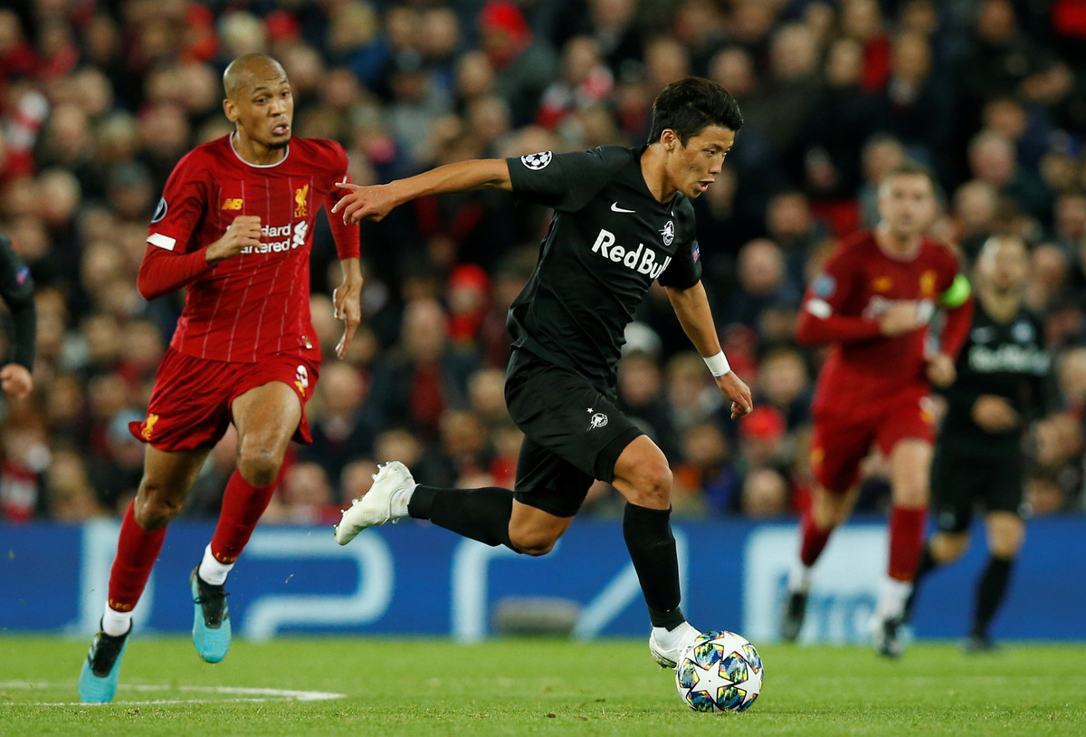 Soccer Football - Champions League - Group E - Liverpool v FC Salzburg - Anfield, Liverpool, Britain - October 2, 2019 FC Salzburg's Hwang Hee-chan in action with Liverpool's Fabinho REUTERS/Andrew Yates