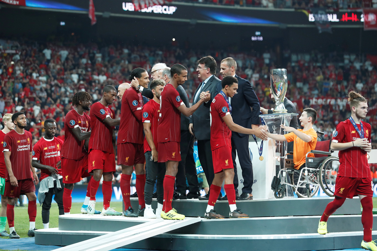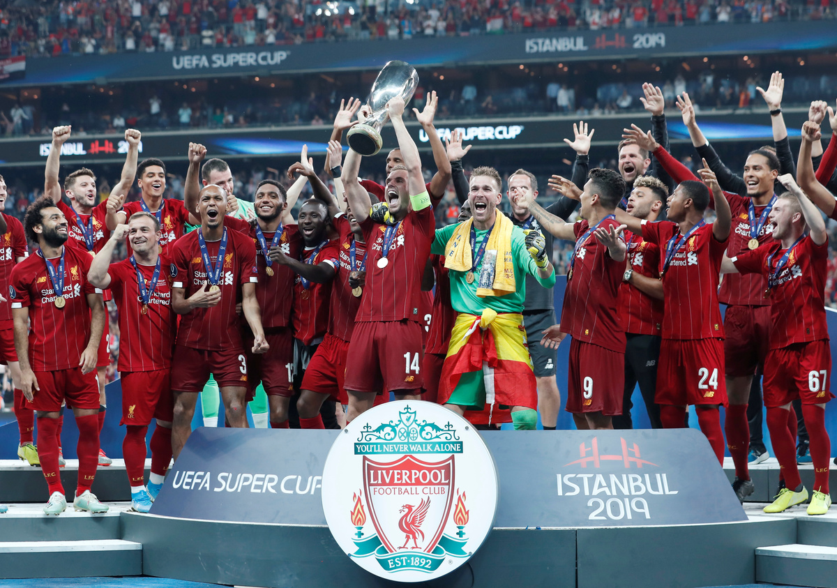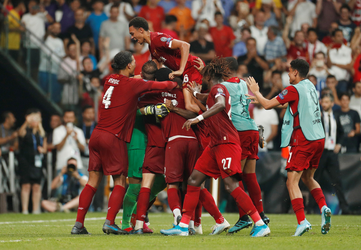 Soccer Football - UEFA Super Cup - Liverpool v Chelsea - Vodafone Arena, Istanbul, Turkey - August 14, 2019 Liverpool players celebrate winning the UEFA Super Cup after a penalty shootout REUTERS/Kemal Aslan