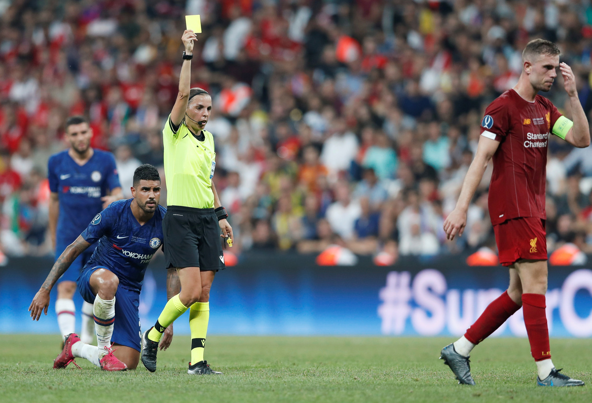 Soccer Football - UEFA Super Cup - Liverpool v Chelsea - Vodafone Arena, Istanbul, Turkey - August 14, 2019 Liverpool's Jordan Henderson is shown a yellow card by referee Stephanie Frappart REUTERS/Murad Sezer