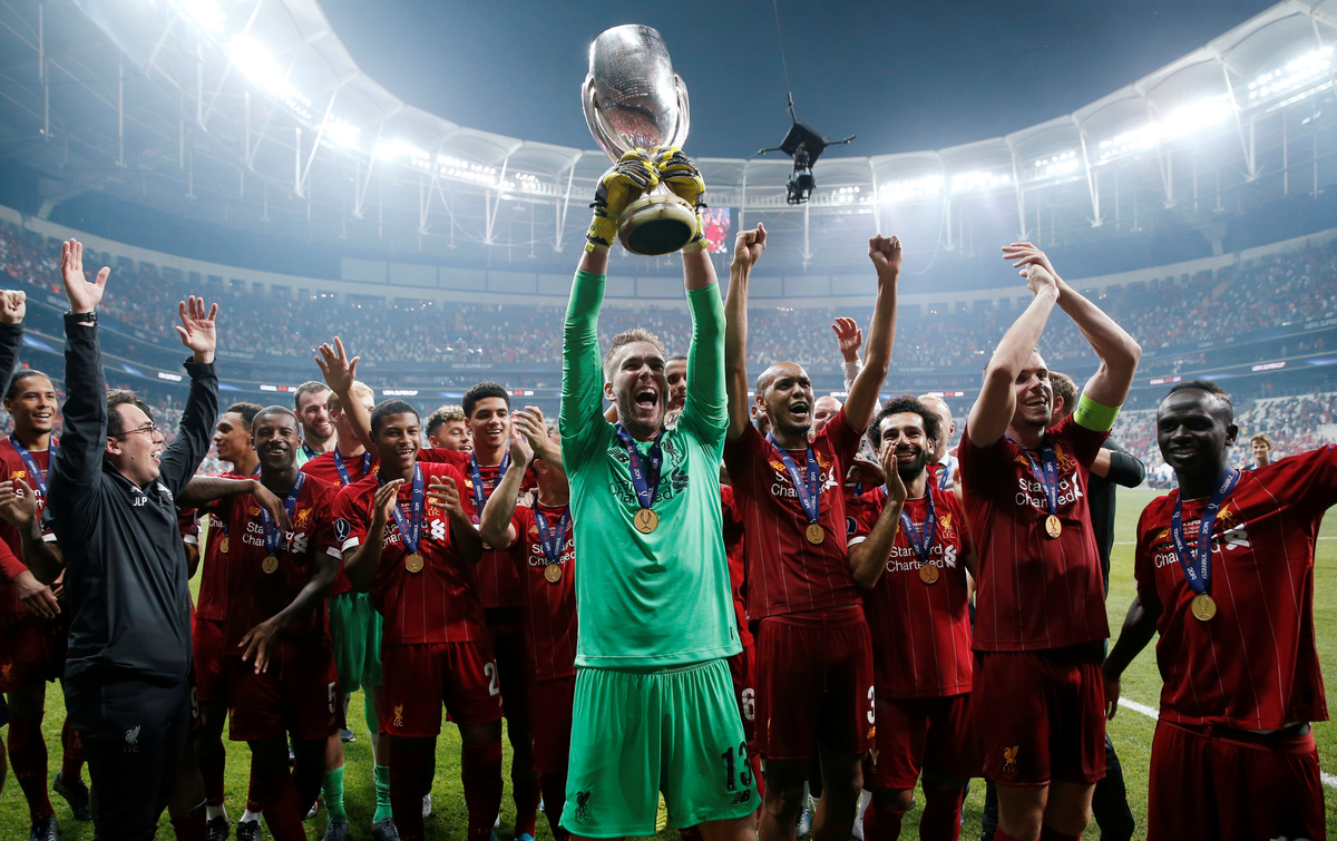 Soccer Football - UEFA Super Cup - Liverpool v Chelsea - Vodafone Arena, Istanbul, Turkey - August 14, 2019 Liverpool's Adrian lifts the trophy as he celebrates winning the UEFA Super Cup with team mates Action Images via Reuters/John Sibley
