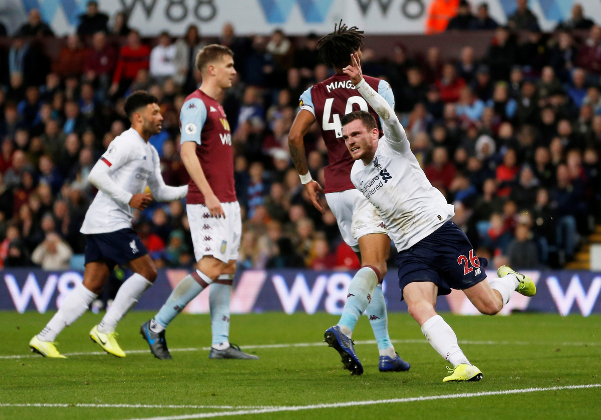 BIRMINGHAM, England (Reuters) - Premier League leaders Liverpool pulled off another extraordinary comeback to win 2-1 at Aston Villa on Saturday with late headed goals from Andy Robertson and Sadio Mane.