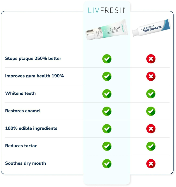 Unlike other toothpastes, LivFresh is unique in that it addresses plaque and gum health at the molecular level. It offers a solution that combines mild care with noticeable results for people who have battled with bleeding gums, stubborn plaque, or sensitivity. Users report a cleaner, fresher breath, smoother teeth, and less bleeding gums. These results are often compared to getting a professional dental cleaning.