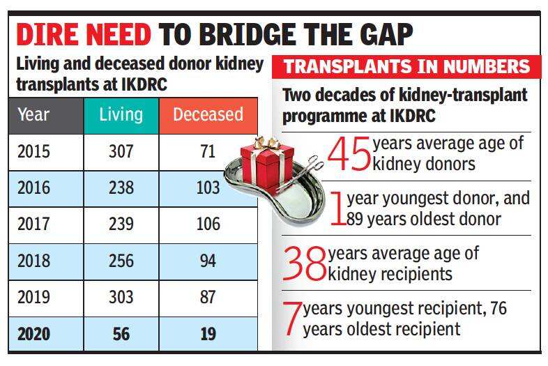 AHMEDABAD: The pandemic hit organ transplant programmes across India very hard. Compared to 390 kidney transplants at IKDRC in 2019, 2020 saw only 75 transplants till March 31. However, what did not change was the ratio of living donors to cadaver kidney donations, at 3:1.