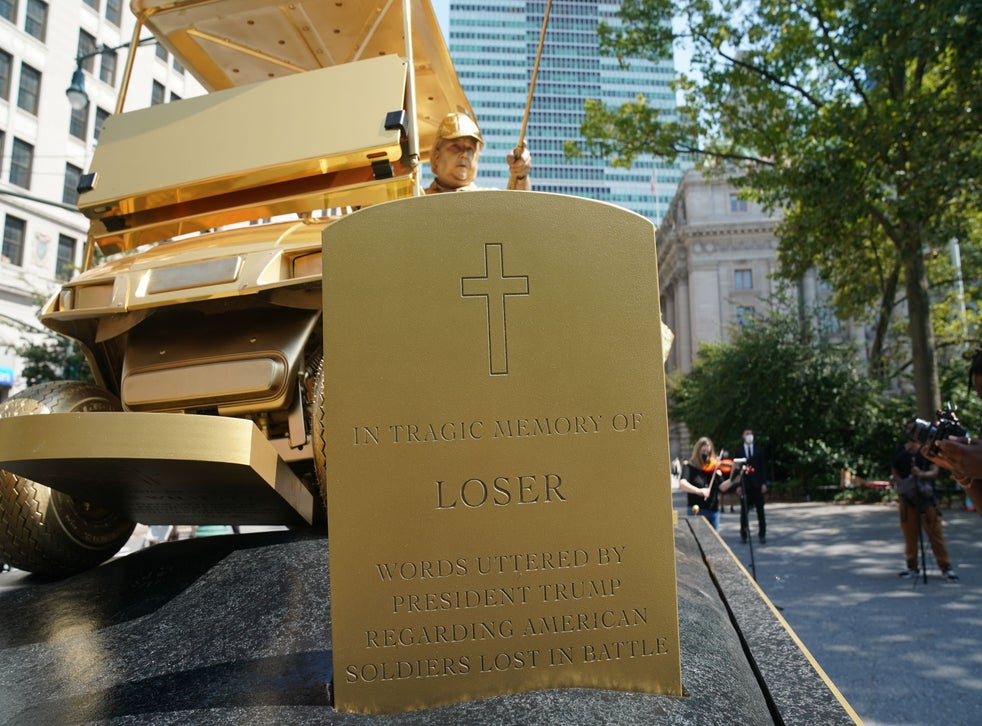 A fifth tombstone reads: “In Tragic Memory Of: ‘Loser’”, continuing: “Words uttered by president Trump regarding American soldiers lost in battle”.