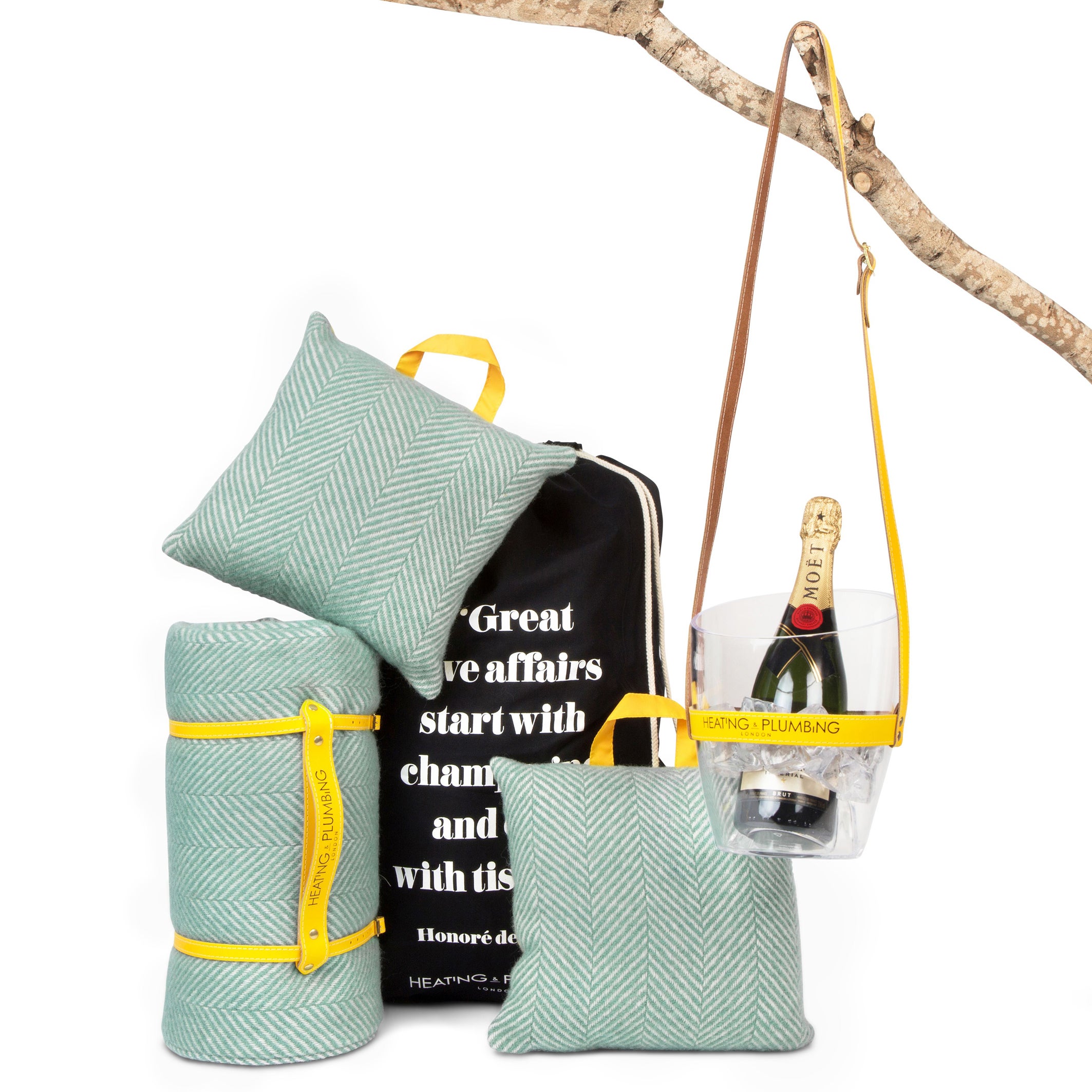 13. Heating & Plumbing London Pure New Wool Picnic Blanket – Mint Green & Yellow, £125; matching Waterproof Outdoor Cushion in Pure New Wool, £44.50; ‘Keep Your Cool’ Champagne Bucket – Yellow Leather Strap, £85, Heating & Plumbing
