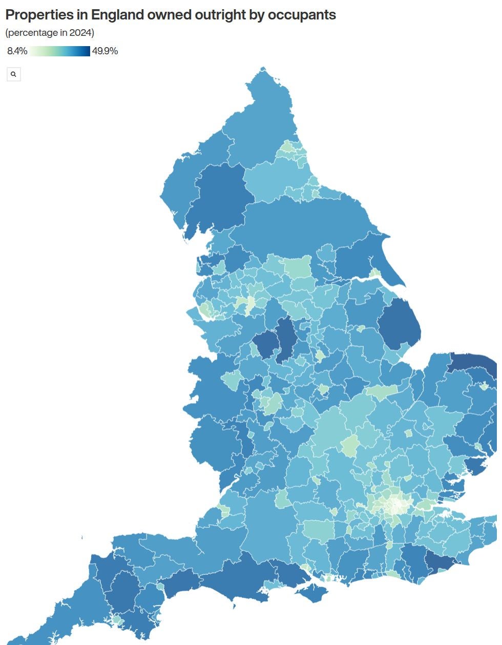 The areas with the lowest percentage of properties owned outright are all in London: Tower Hamlets (8.4%), Hackney (10.1%), Southwark (11.0%), Islington (12.0%) and Lambeth (12.1%).