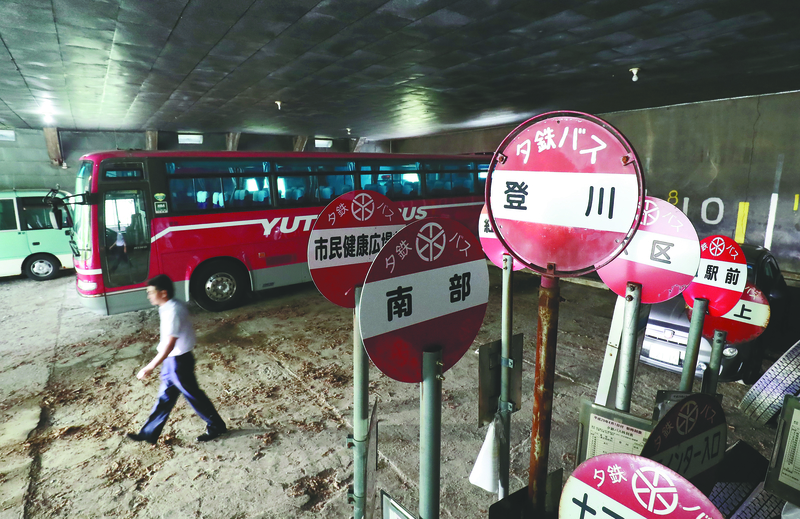 More than 10 bus stop signs remain at the Yutetsu Bus parking area in Yubari, Hokkaido -- set up along two routes that the company terminated in October last year.