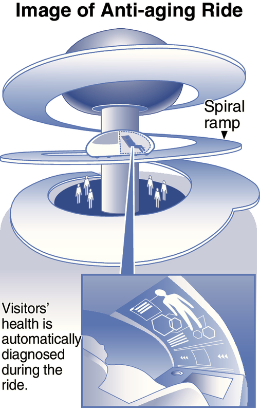 The Anti-aging Ride takes the visitor up a spiral slope from the first floor to the second, measuring their heath vitals along the way. It then determines foods and exercise that can be tailored for "restoring youth."
