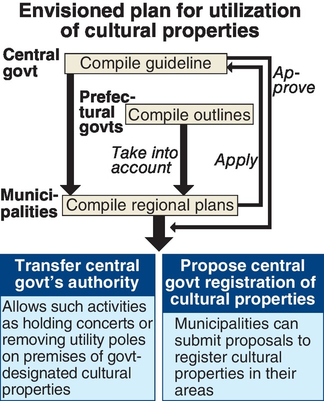 Currently, municipalities must get permission from the Cultural Affairs Agency whenever they make changes involving cultural properties, such as burying electric wires underground to improve scenery that includes buildings and historical sites, or setting up a temporary installation on the premises of a temple or shrine in order to hold a concert.