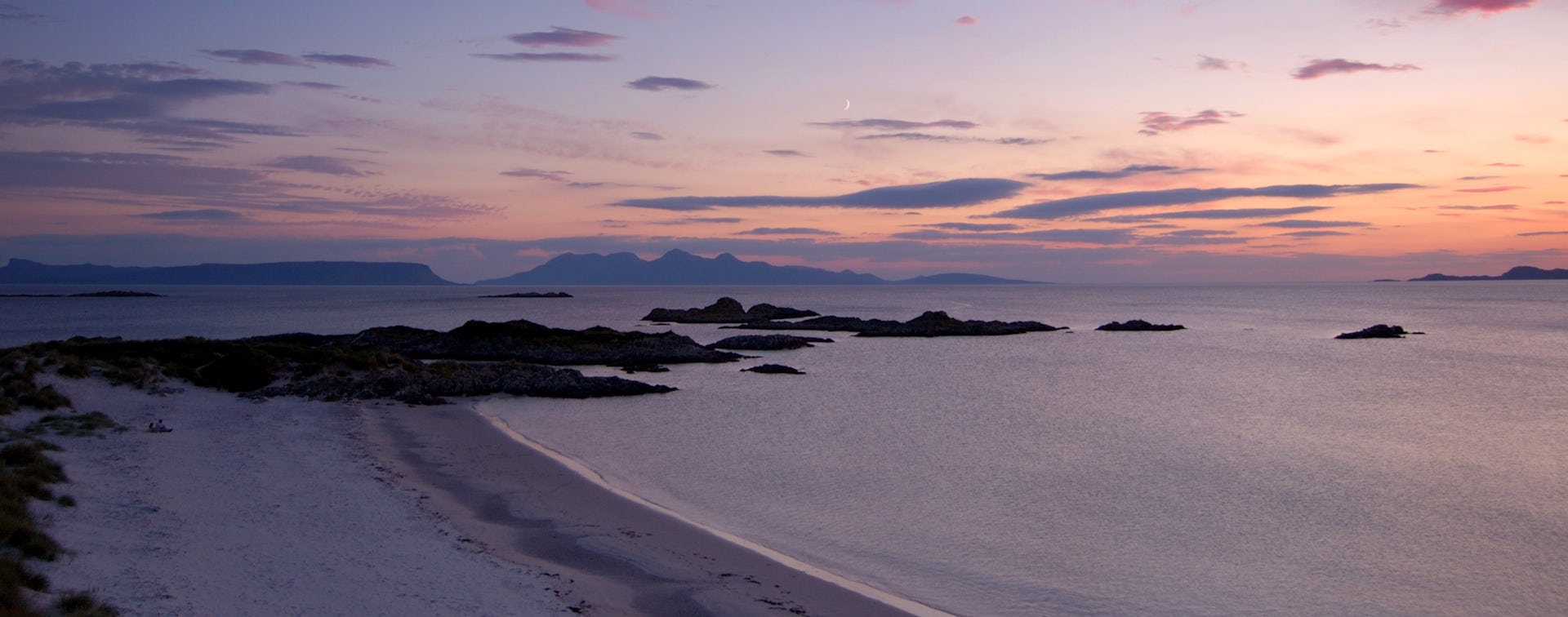 It is well known that the film setting was itself a fiction. Shooting took place in two separate locations 175 miles apart to portray this idealised Scottish community. The main village of whitewashed fishermen’s cottages with its hotel, harbour and iconic red telephone box was filmed in Pennan on the east coast, looking out to the North Sea. The beach location was at Camusdarach on the west coast near Arisaig, looking across the Atlantic to the inner Hebridean islands of Eigg and Rum.