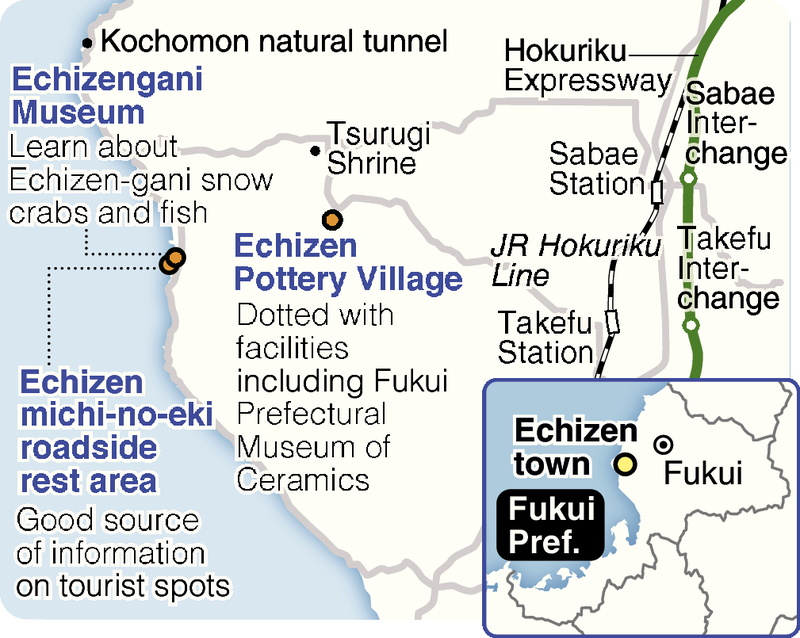 ECHIZEN, Fukui -- Fantastically shaped rocks dot Echizen's coastline. Sheer cliffs face the ocean and behind them sit scattered settlements. The Sea of Japan, which nurtures the Echizen-gani snow crabs that are winter delicacies, also used to be the route for transporting Echizen-yaki pottery -- another local specialty -- to other parts of the nation.