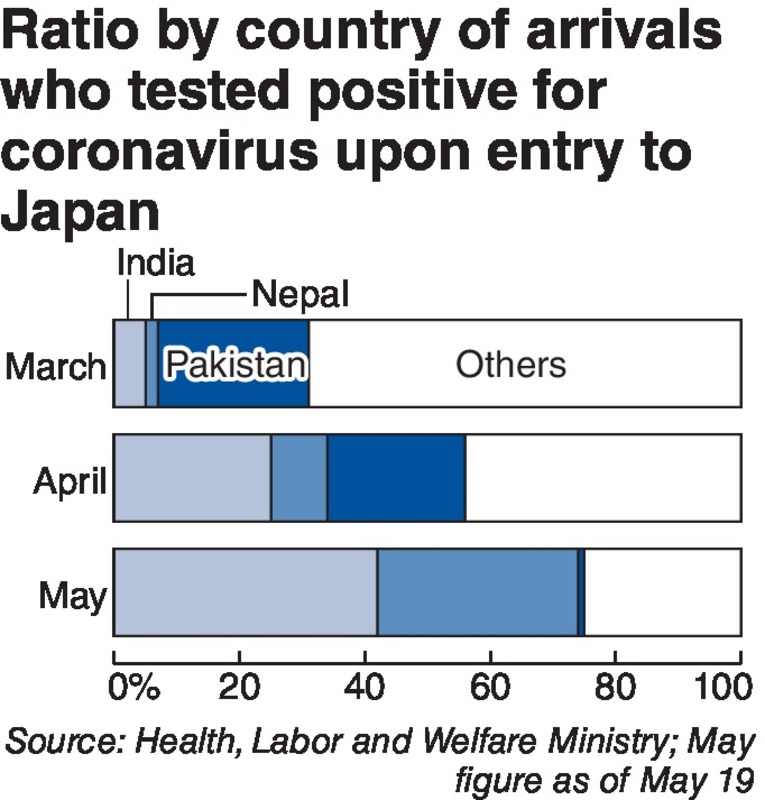 Among arrivals from China, the figure was one in about 6,700. However, about 5% of arrivals from India, Nepal and Pakistan tested positive in Japan.